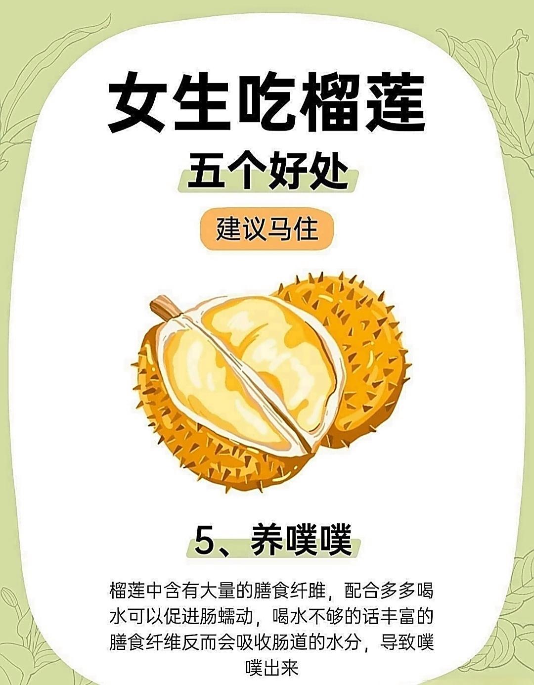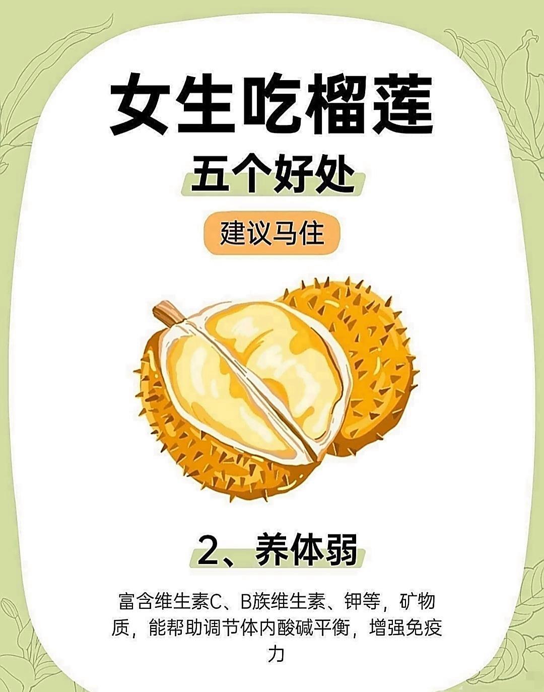 榴莲是一种极具特色的热带水果,被誉为“水果之王”。它外壳坚硬带刺,果肉呈金黄色,质地绵软。其气味浓烈,爱者觉香,厌者觉臭。口感细腻甜润,略带苦味。榴莲营养丰富,富含维生素、矿物质和膳食纤维,深受人们喜爱。榴莲这种水果富含营养,尤其对女生尤其友好,让我们看看女生吃榴莲的好处吧