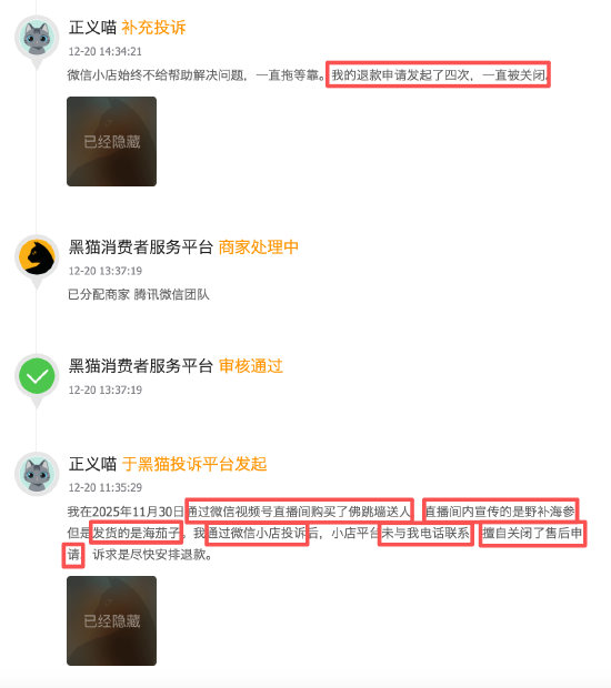 近日,有消费者向黑猫投诉反馈,自己在微信直播间购买了佛跳墙送人,宣传的是野补海参发来的却是海茄子。消费者通过微信小店投诉后,平台没有与消费者联系还前后共四次擅自关闭了售后申请。在黑猫投诉平台上,不少消费者都遇到了在微信平台消费后平台未起到审核监管义务从而维权难的问题。截至目前,微信在黑猫投诉累计投诉量达近2.3万单,回复率仅为5.2%。