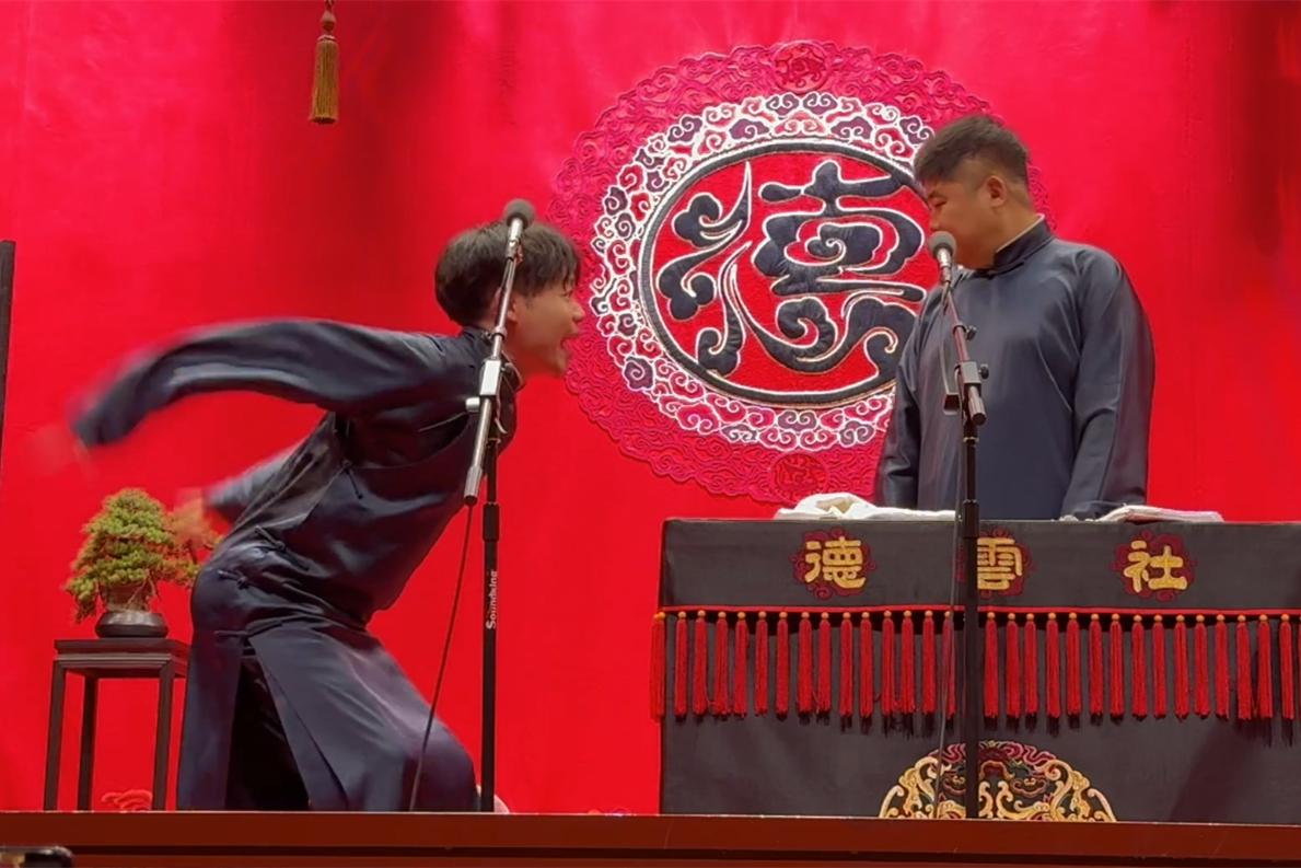孙九芳来到九队后的成长,是肉眼可见的!与刘鹤安搭档后,孙九芳的事业更加稳重,舞台上也更加从容、成熟。24日午场,这两位在天津德云社为观众带来作品《如此服务》。演出一共25分钟。开场3分钟,就频频用砸挂、调侃逗得观众数次爆笑。揣摩小黑粉的心理,还顺手给师父郭德纲平事,巧妙的安排,循序渐进的铺垫,让观众轻松走进剧情,走入他们两个所讲述的故事当中。
