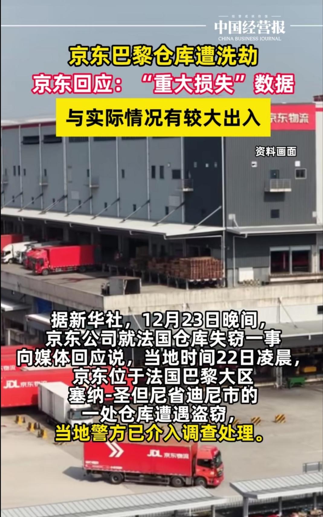 刚刷到“京东海外仓被盗损失3个亿”的新闻,是不是瞬间咯噔一下?5万台3C设备失窃、损失超3700万欧元,这数字看着触目惊心,不少人都在替京东捏把汗,觉得跨境物流这碗饭也太难吃了。 事实是当地时间12月22日凌晨,京东位于巴黎迪尼市的仓库确实遭了窃,还是12人专业团伙作案,切断电网、破坏安防设备,目标直指高价值3C产品。但京东很快澄清,外媒喊的“3.06亿损失”和实际情况差得远,涉事仓库也早就恢复运营。 京东这些年推进“全球织网计划”,在23个国家建了130多个海外仓,背后是实打实的投入和不易。偏偏有些外媒盯着中国企业放大招,靠夸张数据博眼球赚流量。遇事等官方说法,别被带节奏,跨境物流本就难,多些理性看待,少些跟风起哄,才是最该有的态度。