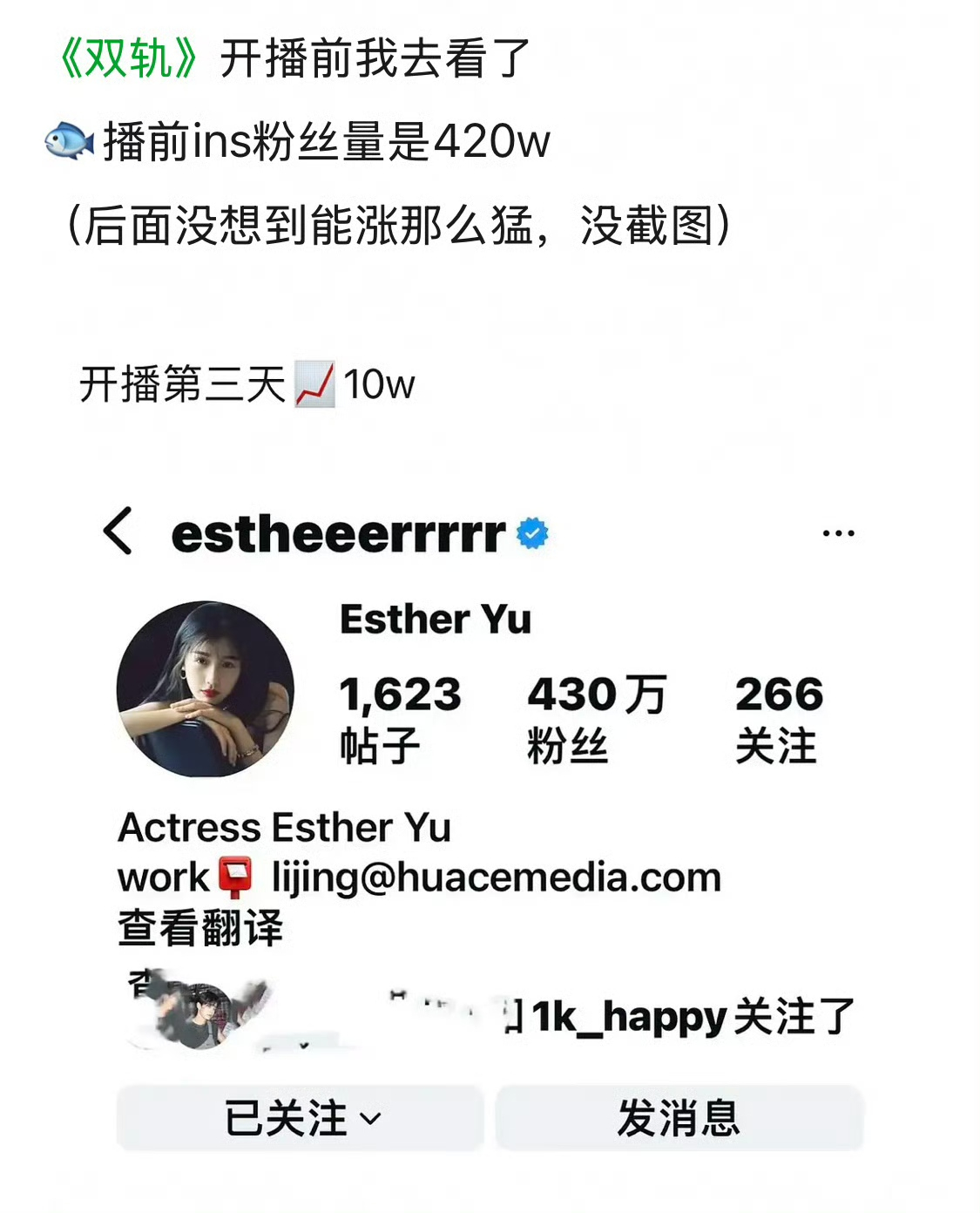 《双轨》在海外播出后效果很好,20多个国家和地区都登上top1,观众也很喜欢姜暮这个角色。 目前虞书欣洋抖粉丝破百万,ins涨粉超40万,角色热度真的很高