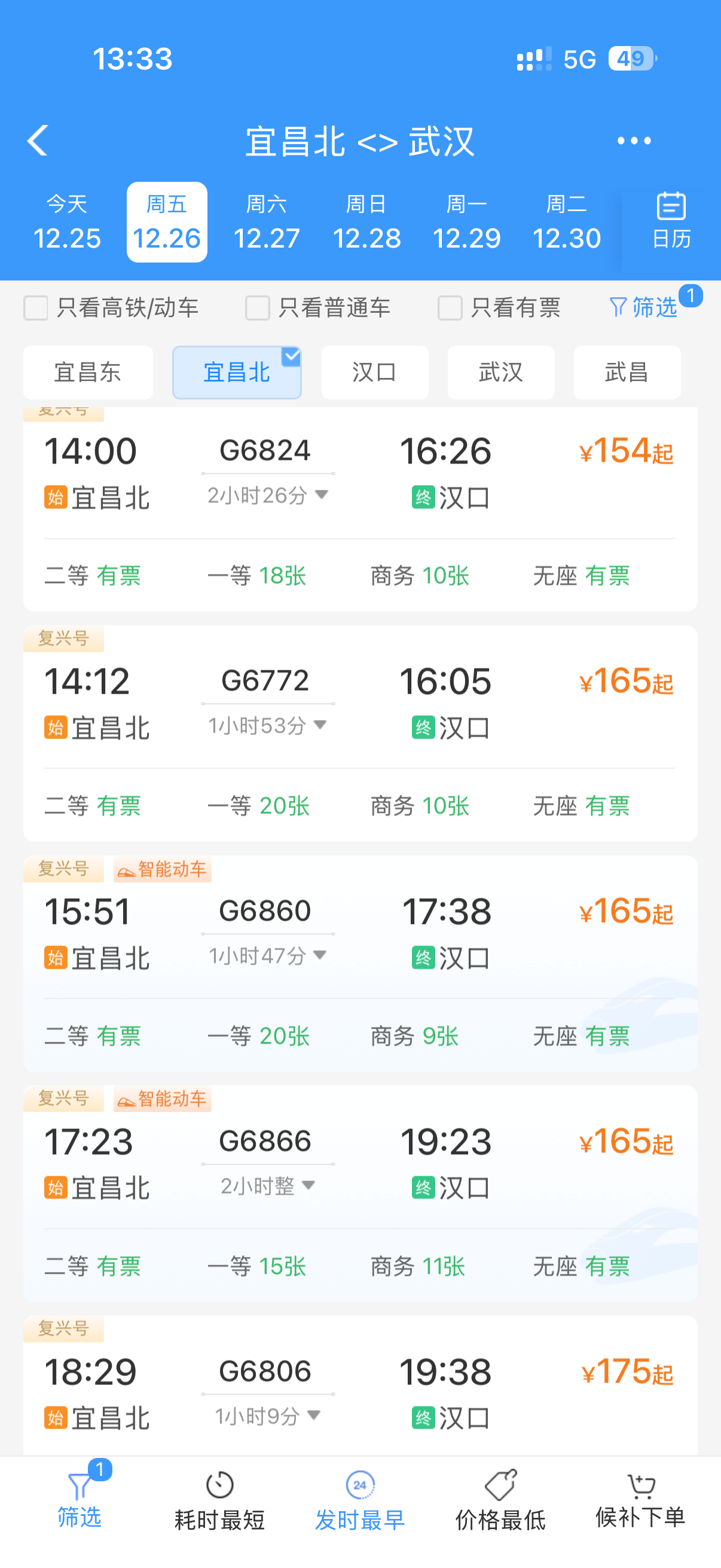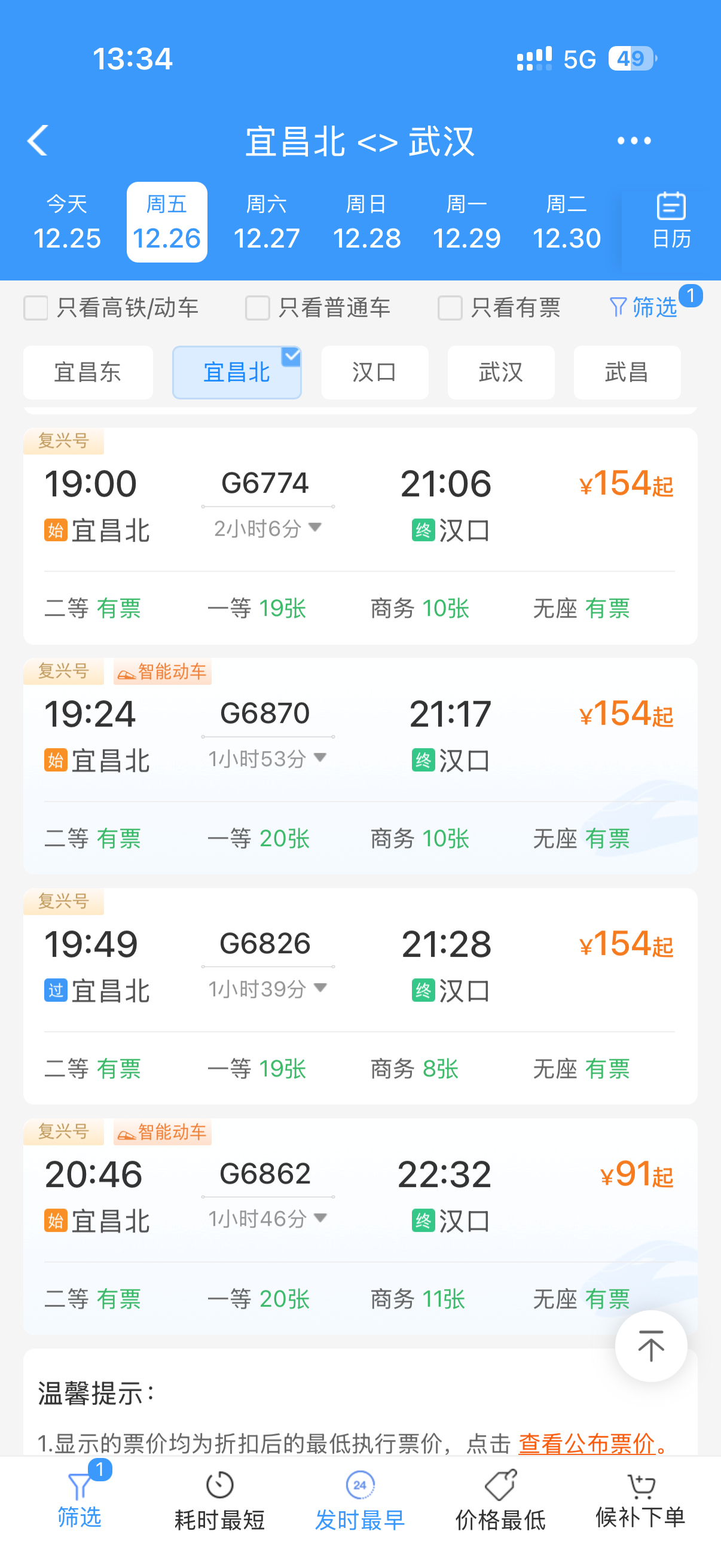 12306APP开始发售沪渝蓉沿江高铁武汉至宜昌段高铁票。首发列车为G6800次,车票分为商务座、一等座、二等座。其中,商务座610元、一等座281元,二等座175元。我还看了一下,末班车G6862次复兴号智能动车组列车票价优惠4.2折,票价91起,随着宜昌北的运营,武汉到宜昌两地又多了出行选择!