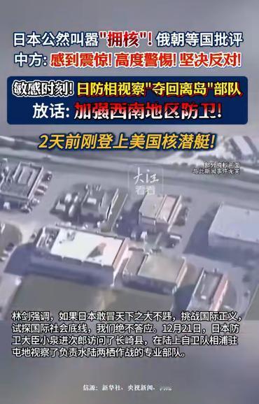 日本公然叫嚣拥核!俄朝等国批评,中方:感到震惊!高度警惕!坚决反对! 最近日本的一系列操作真是让人看不懂又不得不警惕,刚登上美国核潜艇没两天,就有人公然喊着要拥核,防卫大臣还紧接着去视察离岛部队放狠话,这一连串动作凑在一起,很难不让人怀疑背后的心思。 而这件事需要从日本防卫大臣小泉进次郎12月19日刚去了驻日美军横须贺基地说起,当时的他还登上了美国海军的“海狼”级核动力潜艇,把潜艇内部构造都看了个遍。 有意思的是,就在他登艇两天后,12月21日又马不停蹄跑到长崎县的陆上自卫队相浦驻地,视察专门负责离岛防卫的“水陆机动团”。 不光看了队员跳水训练、和“鱼鹰”运输机的协同演习,还亲自坐上两栖装甲车体验机动性,临走前放话“加强西南地区防卫是紧要课题”。 更让人震惊的是,就在小泉登艇的前一天,日本首相官邸有位高官已经先一步抛出了危险言论,说“日本应该拥有核武器”。 后来这人名声也被曝光了,是首相高市早苗的亲信,还是负责核军缩、核不扩散事务的首相辅佐官尾上定正,俩人还是同乡,关系特别近。 说白了,一个负责核军缩的人喊着要拥核,这本身就很讽刺。 日本政府后来出来辩解,说这只是个人意见,不代表官方立场。 但这种说法根本站不住脚,能在非公开的媒体场合说这种话,背后肯定有试探外界反应的意思。 而且这言论一出来,不光周边国家炸了,日本国内也一片反对声。 广岛县议会直接发声明敦促政府坚守“无核三原则”,民间组织递请愿书抗议,在野党更是直接要求尾上定正辞职,连自民党内部都有人质疑,说真要拥核就得退出《不扩散核武器条约》,对日本没半点好处。 周边国家自然不会坐视不管,俄罗斯副外长鲁登科直接表态反对,说日本再军事化只会加剧东北亚紧张局势,还会招来其他国家的反制。 朝鲜更是一针见血,说这不是失言,是暴露了长期拥核的野心,是对国际法的挑战,要是让战犯国家拿到核武器,亚洲各国都得面临核灾难。 中方也明确指出,这是在不断试探国际社会底线,暴露了推动“再军事化”的野心,传递出极其危险的信号。 把这些事串起来看就很清楚了,小泉登美核潜艇、有人叫嚣拥核、视察离岛部队,本质上都是日本加速军事扩张的铺垫。 现在他们一边讨论发展核动力潜艇,一边试探拥核的可能性,还在西南方向强化军事部署,每一步都在突破战后国际秩序的约束。 要知道,日本是唯一遭受过原子弹轰炸的国家,本该更清楚核武器的危害,可现在反而主动往危险的方向凑。 这种不计后果的举动,不光会让自己陷入外交孤立,还会彻底搅乱东北亚的安全局势。 说白了,地区和平稳定容不得半点试探,日本这些危险动向,周边国家都看在眼里,也绝不会坐视不管。 以上都是个人观点,对此您有什么不同的看法,可以在评论区留言讨论!!!