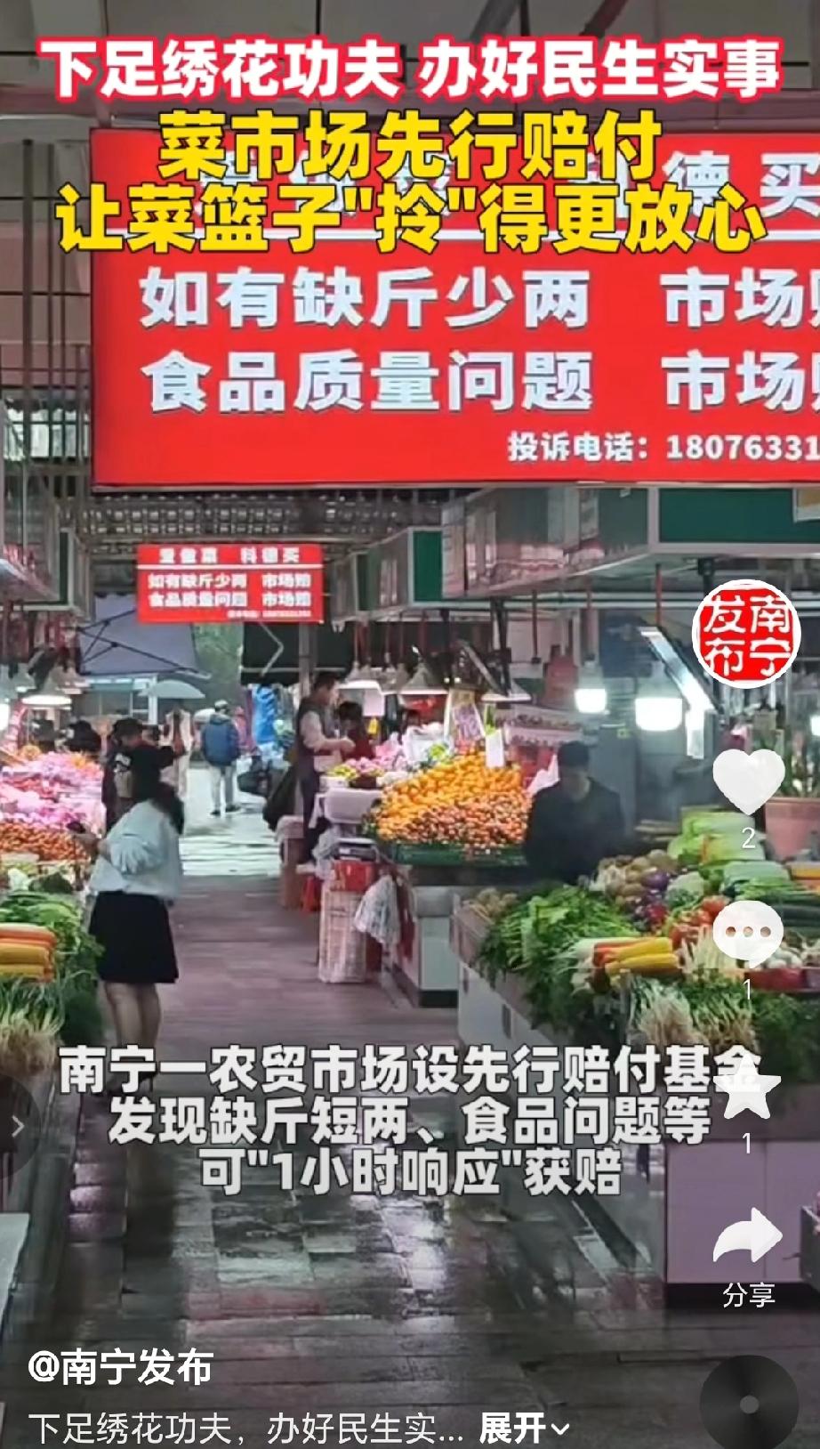 近日南宁一农贸市场推出先行赔付机制的视频内容。该市场设立先行赔付基金,若消费者遇到缺斤少两、食品质量问题等情况,可“1小时响应”获赔。同时,该机制将推广至辖区7家市场,以此让市民买菜更安心。解决了消费纠纷处理的后顾之忧,一旦遇到缺斤少两、食品质量问题,能快速获得赔付,保障了自身合法权益,让买菜更放心、更安心。这是政府和市场管理方用心办好民生实事的体现,从关乎民众日常的“菜篮子”入手,切实提升了市民的获得感和幸福感,也为其他市场的管理和服务升级提供了可借鉴的范例。(来源于@南宁发布)