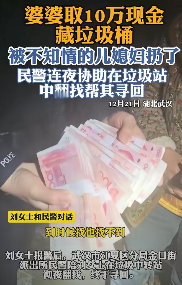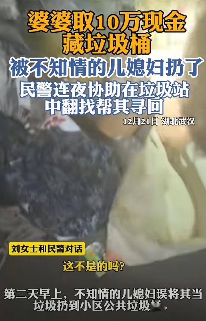 万万没想到!湖北武汉,婆婆独自去银行取了10万元现金拿回家,回家后她把钱装进帆布袋,套上衬衣包裹这塞进垃圾桶里以为这样就安全了,第二天不知情的儿媳妇当做垃圾直接扔进了小区垃圾桶,婆婆发现后连忙报警,最终在民警的陪同下,在垃圾中转站彻夜翻找,找回了被扔的10万元。 想到了她会藏柜子或者枕头下,就是没有想到她会把钱藏在垃圾桶里,结果还被不知情的儿媳妇当垃圾扔了,由此可见这婆婆心眼太多,原本可能是不想让儿媳知道,这下全网都知道了,好在最终民警帮忙找到了。 一家人就应该坦诚相待,如果婆婆取钱回去告诉了儿媳,也就不会发生接下来的事,就算是不想说,那也应该放到柜子里或者抽屉里,这样起码不会被当垃圾扔了。