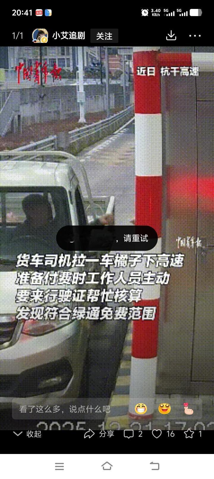 谁懂啊!浙江高速收费员这一眼,直接给货车司机省下一笔真金白银! 司机交完费都要开车走了,收费员无意间瞥了眼车厢,发现装的是新鲜橘子,立马喊住他查行驶证。 原来橘子属于绿通目录里的鲜活农产品,而且装载重量达到了核定载重量的85%,完全符合免费要求。 要知道很多好政策都卡在“最后一公里”,要么司机不懂政策白花钱,要么工作人员机械办事不提醒。 但这位收费员的主动多问、细心核验,让冷冰冰的规定有了温度。 绿通政策的初衷本就是惠民,让果蔬低成本运到餐桌,而真正的服务从来不是按流程走个过场,而是多一份主动和用心。 你有没有遇到过这种暖心的服务?或者知道哪些容易被忽略的惠民政策,来评论区分享下~
