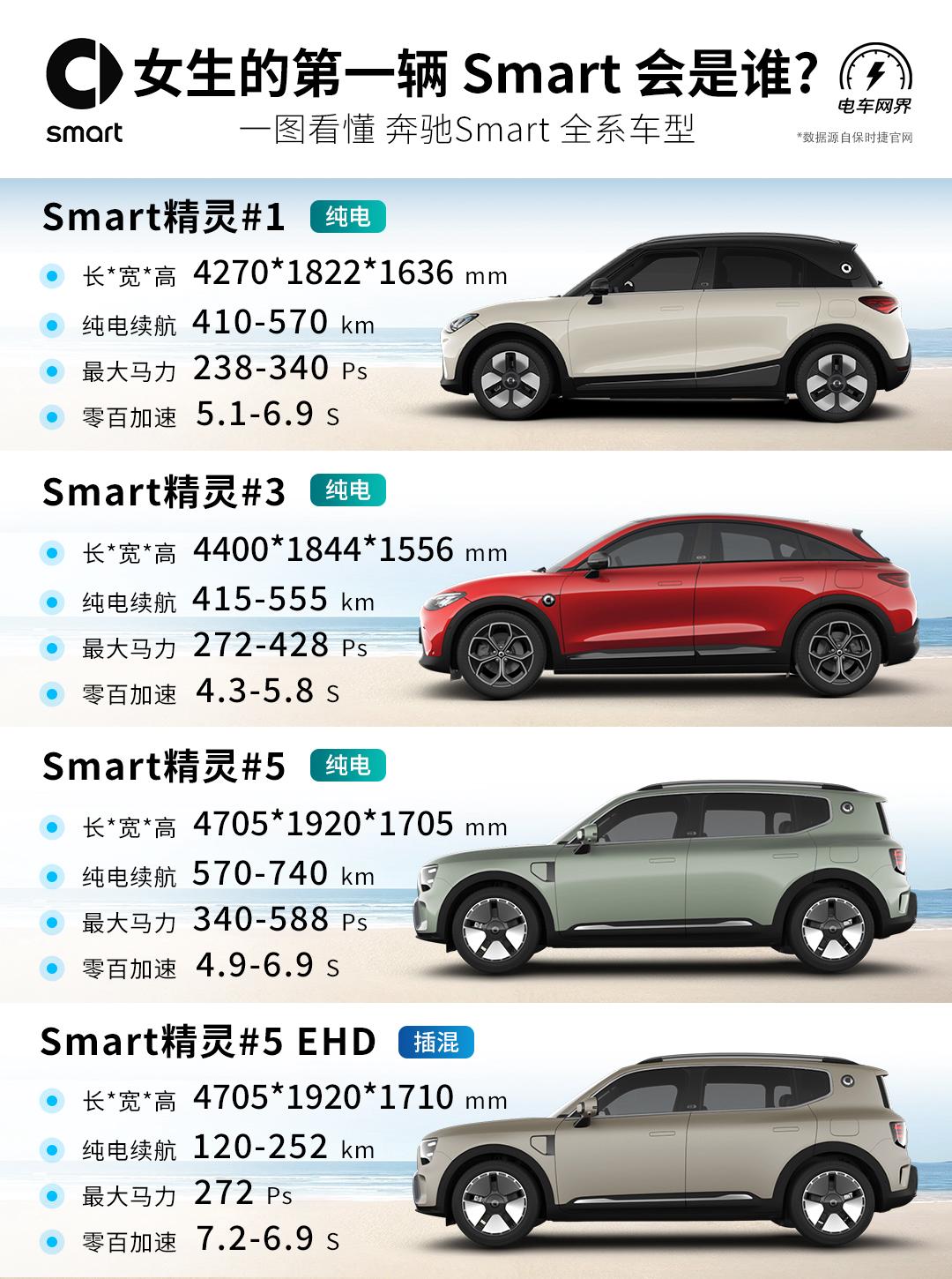 深受女生喜欢的奔驰smart到底有哪些车? 看完这篇你就懂了! ✦ smart精灵1:小型纯电SUV,售价15.49万起。主打城市通勤,CLTC续航570km,高功率版零百加速5.1秒(BRABUS性能版3.6秒)。 ✦ smart精灵3:紧凑型纯电轿跑SUV,售价16.49万起。长续版纯电555km,四驱版零百加速4.3秒(BRABUS性能版3.6秒)。 ✦ smart精灵5 纯电版:中型SUV,售价22.99万起。轴距2900mm,四驱版4.9秒破百(BRABUS性能版3.8秒)。 ✦ smart精灵5 EHD超级电混版:品牌首款插混车型,限时16.99万起。搭载1.5T+三挡DHT,CLTC综合续航达1615km,纯电续航提供120km与252km两种版本,支持快充与低油耗长途出行。 即将发布车型动态: ✦ smart精灵6:全新中型插混轿跑,车长超4.9米,轴距2926mm,采用掀背设计,定位家庭用户,预计2026年上市。 ✦ smart精灵2:基于全新ECA架构的纯电小车,将回归双门双座、后轮驱动的经典布局,致敬fortwo,预计2026年发布,重拾品牌个性基因。 —————— 品牌简述:smart是源自德国的微型车品牌,由梅赛德斯-奔驰与瑞士Swatch合作创立,现为梅赛德斯-奔驰与吉利(各持股50%)合资的智能纯电汽车品牌,主打智能科技与新奢设计的豪华紧凑型电动车。 简单了解之后,你觉得哪辆Smart最适合你呢【来自懂车帝车友圈】