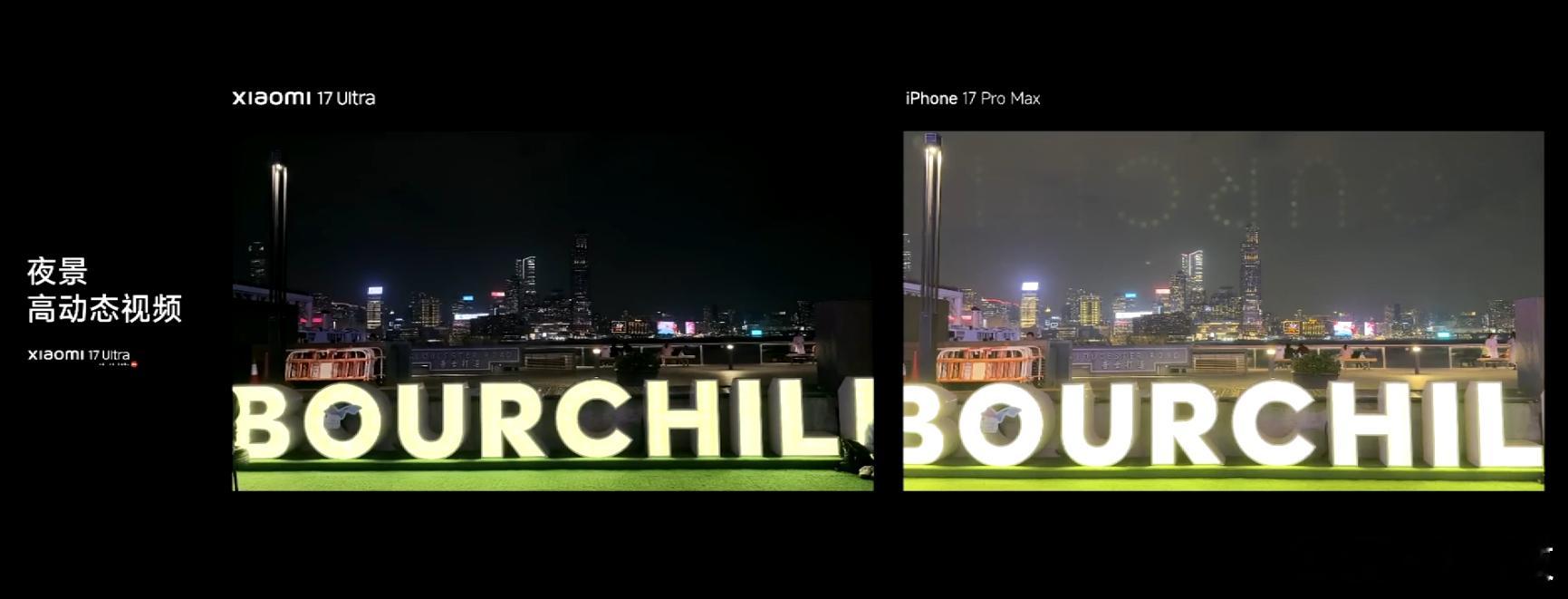 夜景高动态视频,小米17 Ultra对比iPhone 17 Pro Max。这个