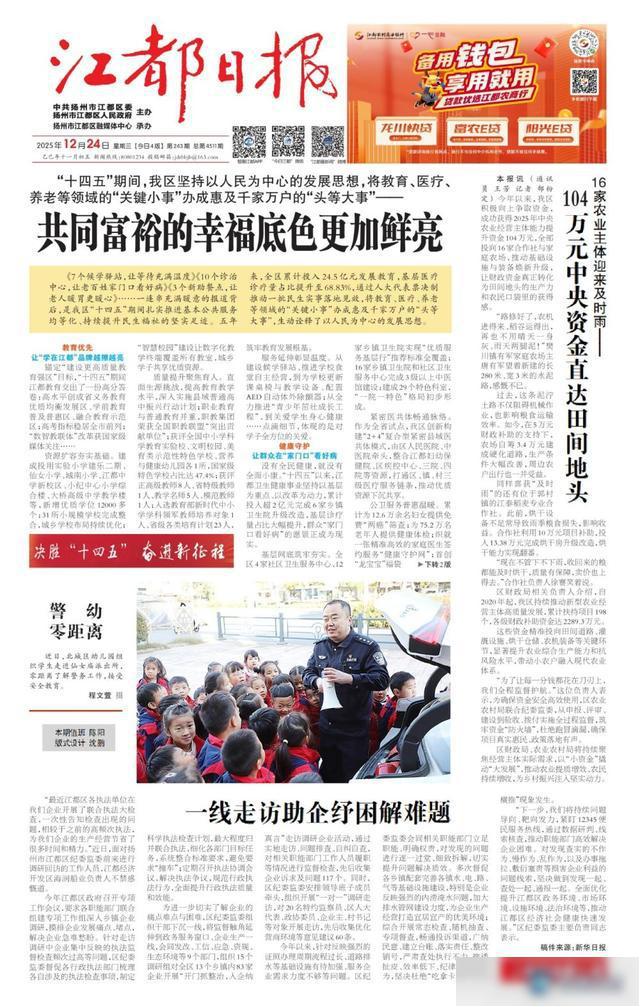 项目成效看得见摸得着。仅2024年,即完成江都中学新校区、妇幼保健院门急诊大楼等重大工程;为中小学、幼儿园教室安装空调1694台、更换课桌椅6600套;改造老旧小区24个,加装电梯13部;建设筹集保障性租赁住房3936套;新建生态河道271公里;免费实施白内障复明手术400例;建成市级颐养示范社区6个、农村互助睦邻点21个、城市社区助餐点5个;开设“爱心暑托班”服务青少年560余名……一桩桩实事,精准回应了百姓对宜居、出行、养老、扶幼的美好期盼。
