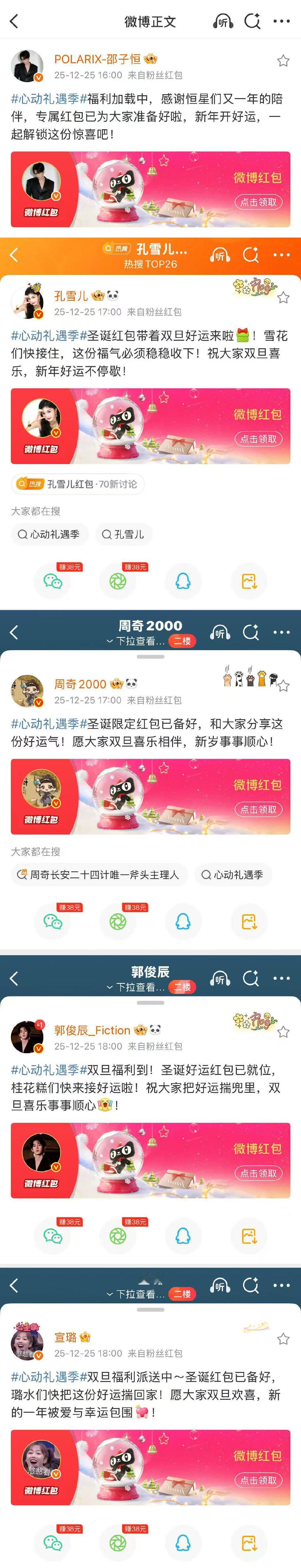 你担喊你抢红包啦 双旦狂欢福利加码!10位艺人空降微博狂撒红包,限时派送错过再等一年!手速党速速集合,定好闹钟盯紧整点,说不定你心心念念的TA就在发红包,红包揣兜好运翻倍,年末收官必须甜甜蜜蜜,快喊追星搭子一起蹲守~