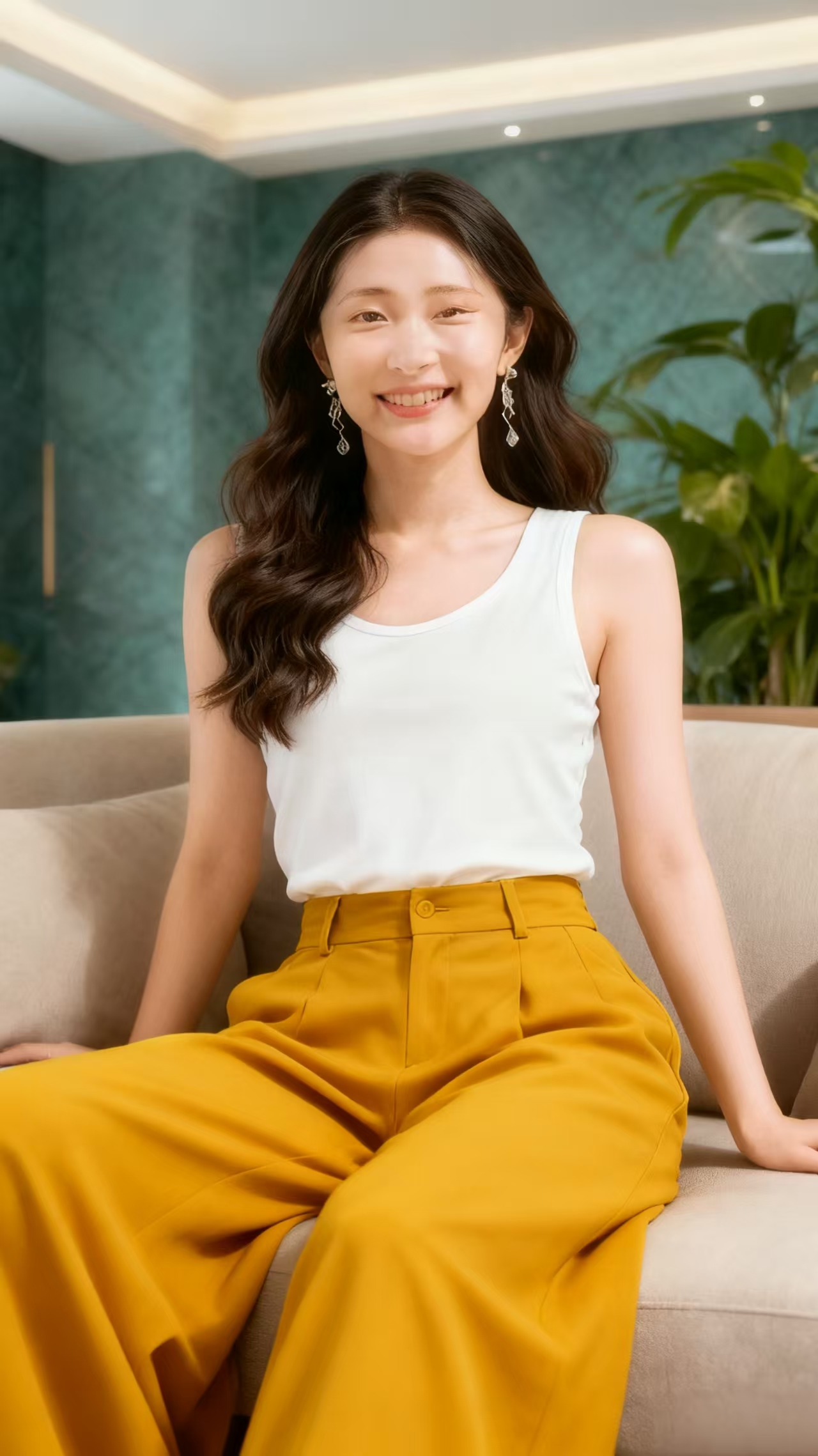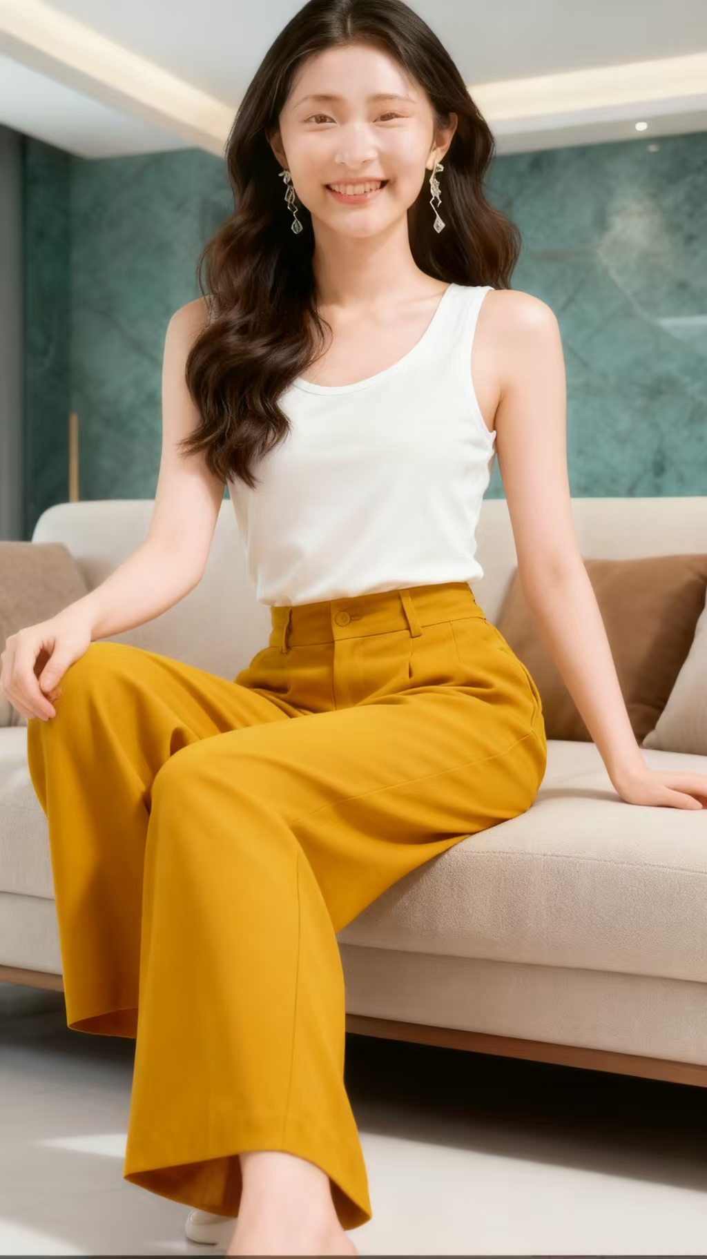 简约休闲风:黄色高腰直筒裤搭配白色上衣,鲜艳明媚。