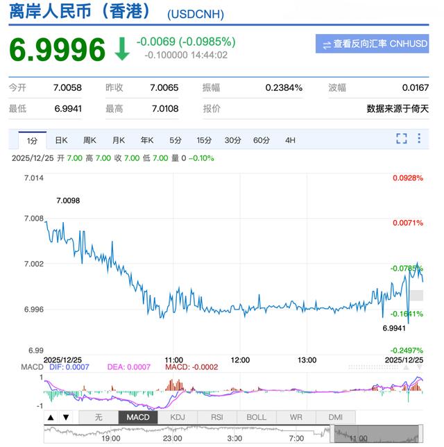 12月25日上午,离岸人民币对美元汇率续创2024年9月以来新高,收复7.0整数关口。同时,在岸市场同样表现强劲,在岸人民币兑美元汇率升破7.01元,最高触及7.0052元,逐步逼近7.0大关。