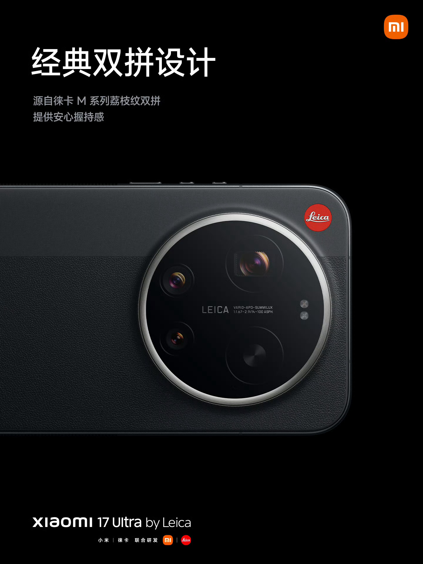 小米 17 Ultra 徕卡版,小米 x 徕卡战略共创升级,经典黑白双色,拼皮设计,徕卡经典红标,中框精雕滚花,镌刻徕卡铭文