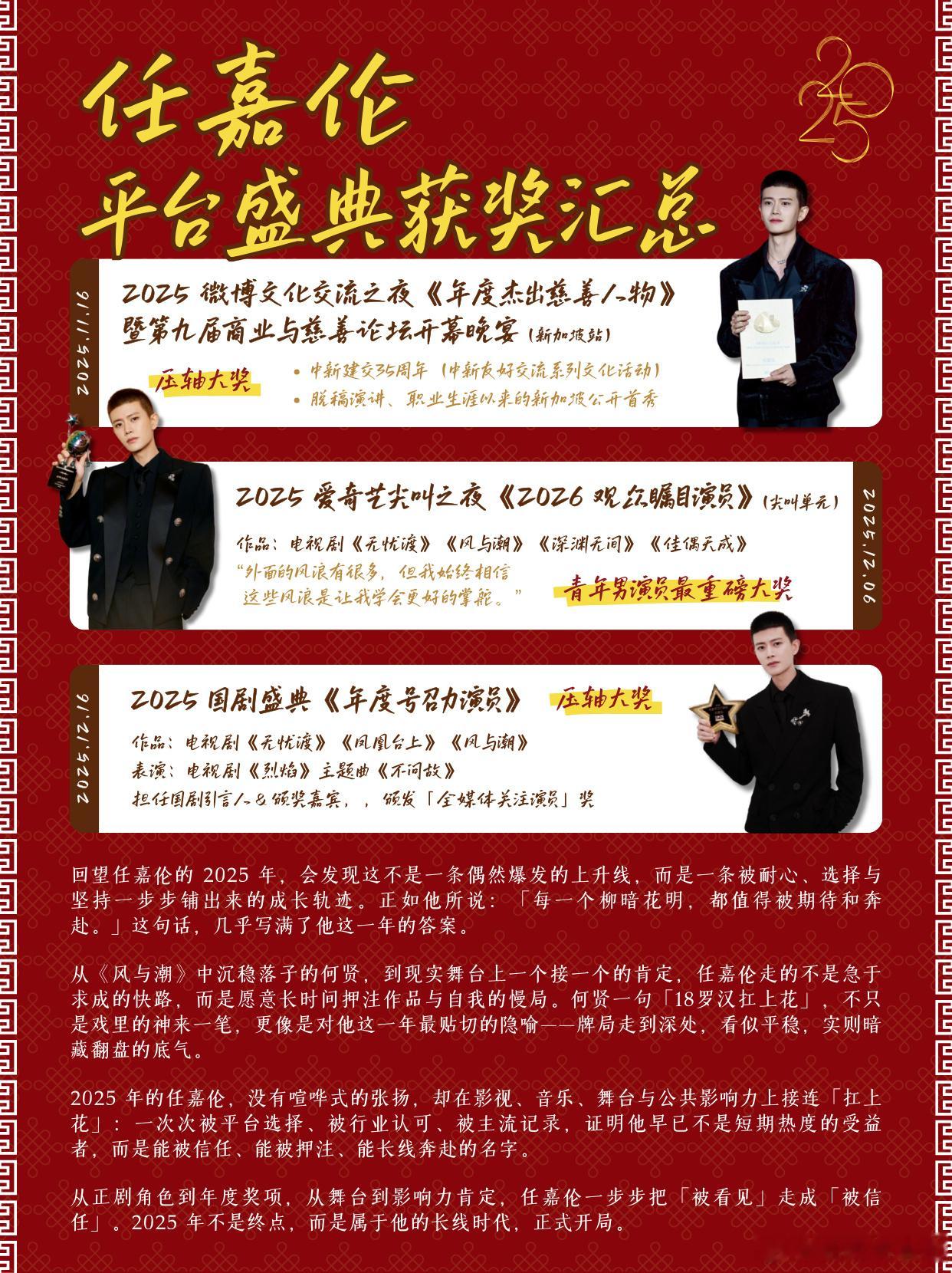2025 年任嘉伦累计斩获多项平台级大奖,涵盖青年男演员、年度号召力、年度人物等