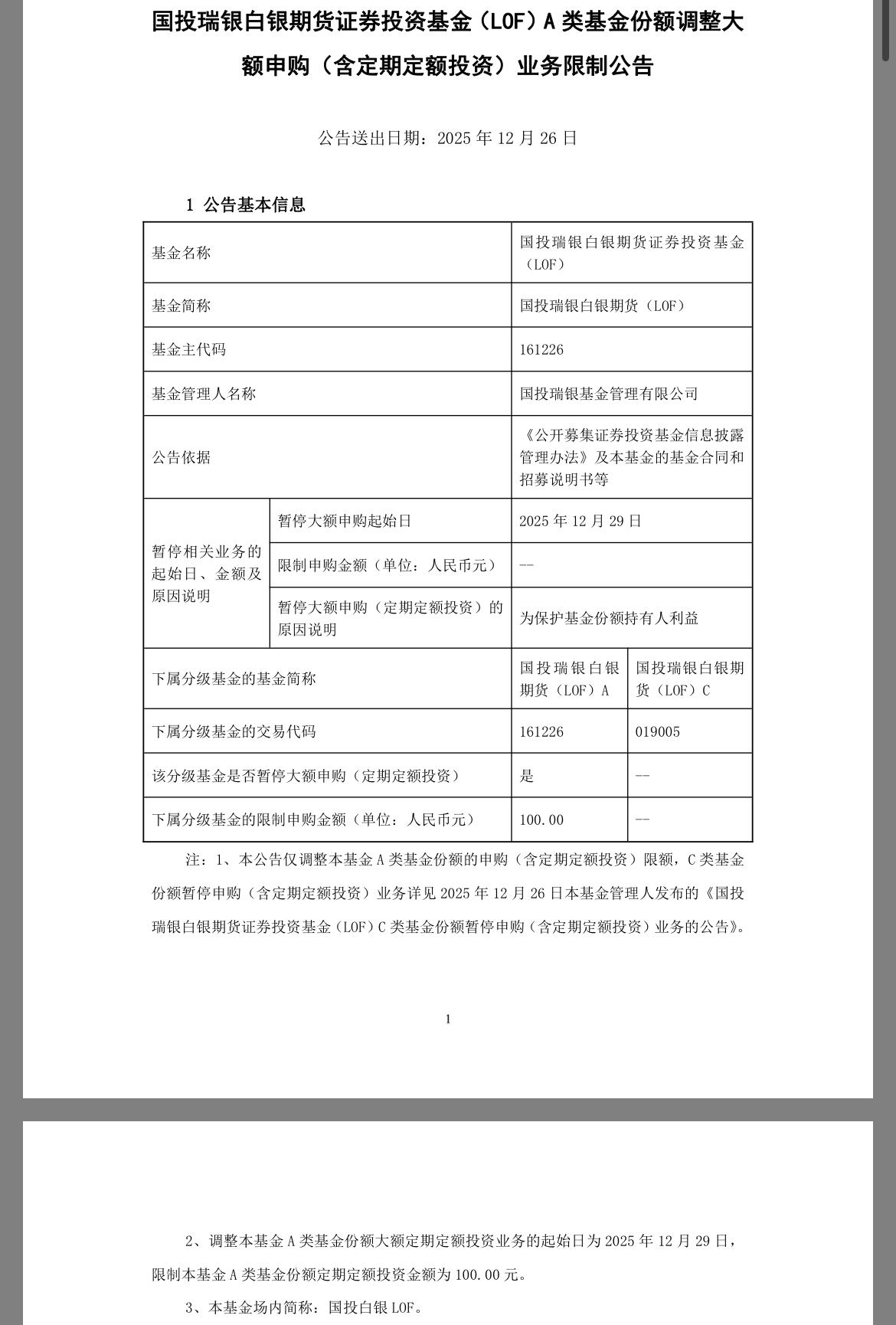 国投白银LOF没有跑掉,还能申购吗,接下来该如何应对 我说一下我的看法,大家共同学习讨论。 1、今天没有跑掉,怎么办? 没有跑掉是你太贪了,但凡挂一个水下的价格,今天就可以跑掉,你非挂涨停,溢价60%+了,市场哪有那么多S子。接下来的几天大家就要拼谁跑的快了,我这边知道几个券商的挂单技巧,大家可以参考: 川财证券夜盘20:00左右开始; 东财夜盘第一批是下午4:15左右开始、第二批份额到账是晚上九点左右,到账后可以挂单; 银河是下午4点可以用委托助手,夜市委托时间:下午17:30-19:00可以夜市委托,19:00-23:30(清算时间,不接受委托),清算完成后可以夜市委托。不过这个23:30,并不是完全绝对的,早一点也可能22点,晚点也可能24点,根据交易所每日数据量,时间不固定,只是大概23:30; 麦高证券夜市委托20:00,第二批份额到账时间在9点左右,到账后可以委托; 兴业证券17:00开始夜盘委托助手,但是最终的夜市委托以24点准时开始,也就是说兴业证券的夜盘要凌晨24点准时挂单才能排前面; 其它券商我没用过,具体就要自己问了,不管你开的啥车,能下车都是好车! 2、跌停了,还能申购吗? 申购!因为国投白银lof是全市场唯一和白银挂钩的lof产品,未来很长的时间内都很难砸到折价,长期保持一定的溢价是大概率的事情,再加上基金公司公告,从12月29日开始,A类限额又回到100了,所以明天是最后一天可以申购500的机会了。 一波套利下来,希望大家不仅把钱赚了,而且技术也进步了,这样才是一个完整的经历!才有意义。