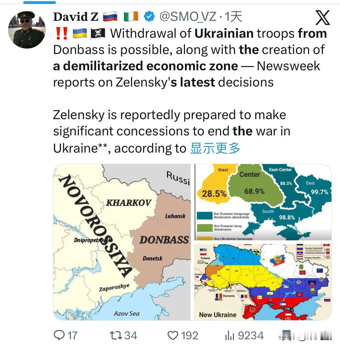 据《新闻周刊》报道,泽连斯基的最新决定表明,乌克兰军队有可能从顿巴斯撤出,并建立非军事经济区。 报道称,泽连斯基据称准备做出重大让步以结束乌克兰战争** 。 - 他表示愿意从顿巴斯部分地区(特别是顿涅茨克地区剩余的乌克兰控制区)撤出乌克兰武装部队,并建立一个非军事化的“自由经济区”,但前提是俄罗斯也必须撤出其部队,撤出距离相等 (例如双方各撤出 5 公里、10 公里或更多。 这被视为基辅在领土控制问题上的一个显著转变,此前基辅一直拒绝放弃这些领土控制权。 这一进展源于泽连斯基在2025年12月23日提出的修订版20点和平计划,而此时美国正在斡旋进行谈判。 《新闻周刊》、《纽约时报》和 BBC 等消息来源证实,该提议涉及相互撤军,以在乌克兰东部建立一个非军事缓冲区,可能包括克拉马托尔斯克和斯拉维扬斯克等重要城市。 然而,该提议是有条件的,并且是互惠的 ——不是单方面的让步——而且俄罗斯尚未表示同意。 当然,这还远远不够,而西方媒体却将其视为解决陷入僵局的领土争端方面取得的进展。 最终,该地区的自由选举将要求举行全民公投,将多达 12 个州归还俄罗斯…… 谁会愿意生活在一个破产的乌克兰垃圾场里?