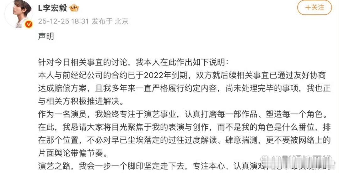工作室称李宏毅目前经济能力不足25日,李宏毅与芒果娱乐解除经纪合同纠纷案被执行约1118万元,法院向其签发限制消费令引发热议。对此,李宏毅发说明回应,称限制高消费措施仅仅是因为李宏毅目前经济能力不足,没有能力立即履行全部判决款项。“此事件不属于违法犯罪行为,也不属于违背公序良俗的行为,不会影响李宏毅与任何合作方的合作。”