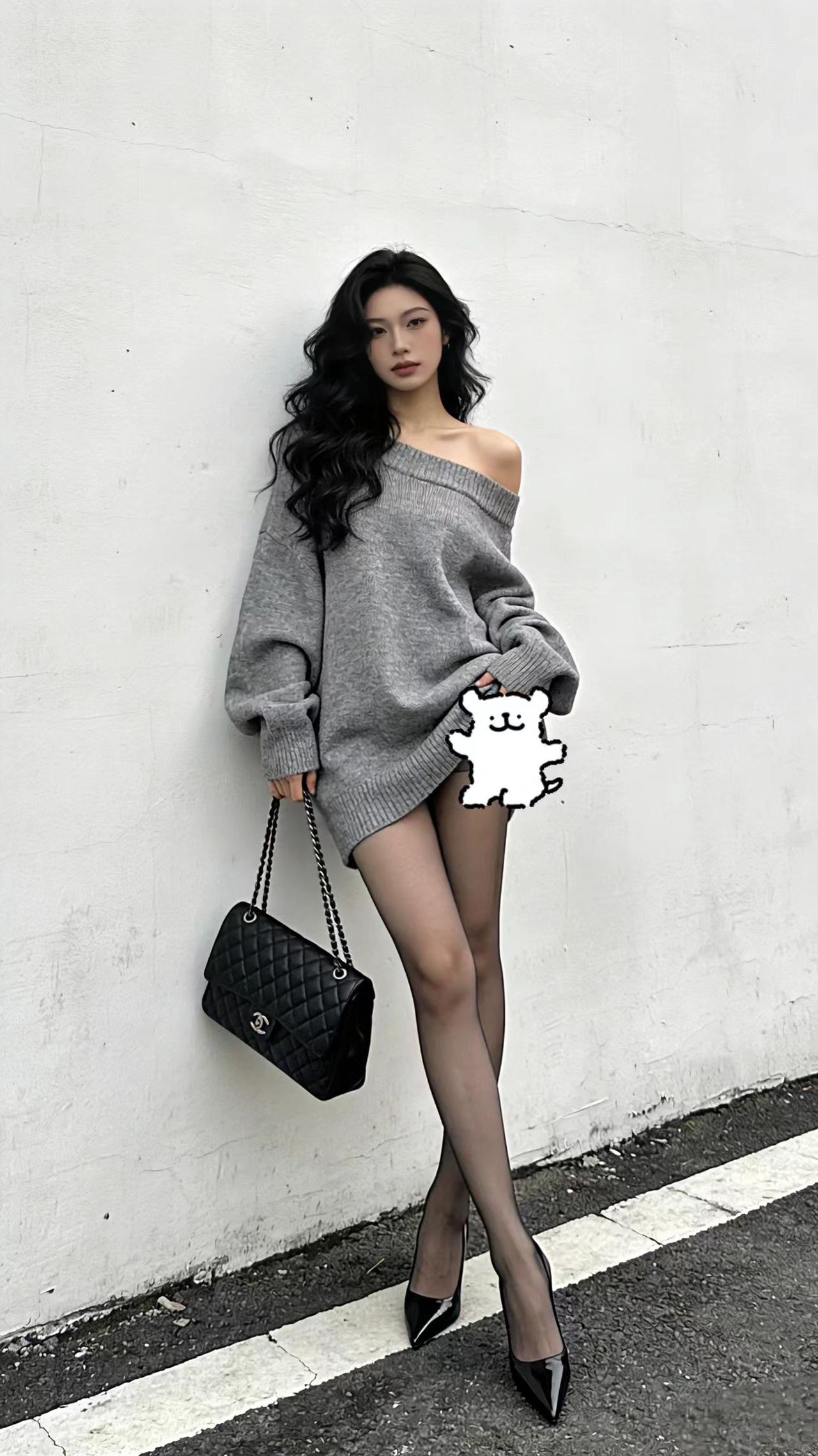灰调露肩毛衣+黑丝,链条包+尖头高跟鞋点睛,往白墙旁一靠就是自带故事感的都市画报