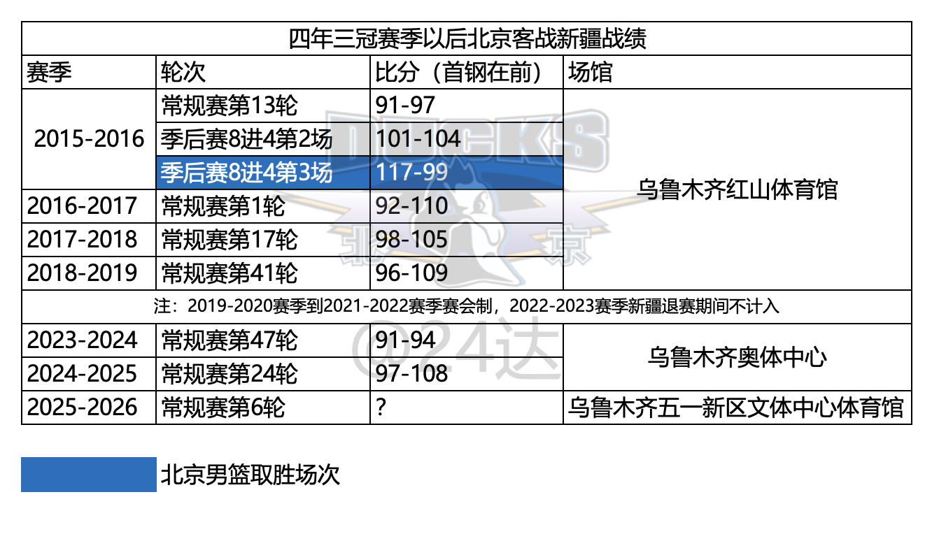 💙比赛日•赛前海报主题:挑战天山CBA常规赛第6轮北京北汽vs新疆伊力特2025年12月26日 20点00分乌鲁木齐五一新区体育馆从新疆这个客场为标志,最艰险的4场比赛开始,从赛程安排、比赛环境、体能储备和分配来说,这绝对是一次考验。也是一次综合的考察。新疆这个客场,无论是之前的红山,还是后面的奥体中心体育馆,一直就是极其难以攻克的地方。【图2】自打四年三冠以后,除16年季后赛第三场客场取胜,赛会制和23年新疆退赛时期,首钢再也没有在新疆的客场拿到过哪怕任何一场的胜利。这是CBA最难攻克的几个客场之一。但是新疆最近情况非常糟糕,他们过去历史上传统上还是一个以防守立足的队伍,但是本赛季发生了倒挂,他们这个赛季无论是防守效率还是失分都是联盟最差。很多比赛基本就是一个对外线不设防的一个状态。本身这个球队又不是一个以攻补防的队伍,场均得分和进攻效率都是联盟中游。所以最近对于刘炜指导的下课声不绝于耳。但是,还是那句话,40分钟的比赛,无论从备战还是比赛状态,我们根本就没有放松的资本。本场比赛出现了一些变数,首先,周琦不打回京修整以后,内线的轮转怎么办,尤其是最近受到质疑比较多的马帝昂和范子铭,这场比赛需要承担更多的攻防责任。许指导临场的布置需要仔细考虑。其次,小曾目前能不能出场,还没有正式定论,目前我的消息源说是大概率,赛前踩场的时候就会有个定论。出场的话,就需要看在一个全新升级的队伍当中,他的融入程度。还有毕竟长期没有比赛,他的比赛状态一定是需要逐步恢复的,肯定需要有一个耐心。加油吧,希望在打破魔咒的同时,能够延续咱们的连胜!北京必胜!💙