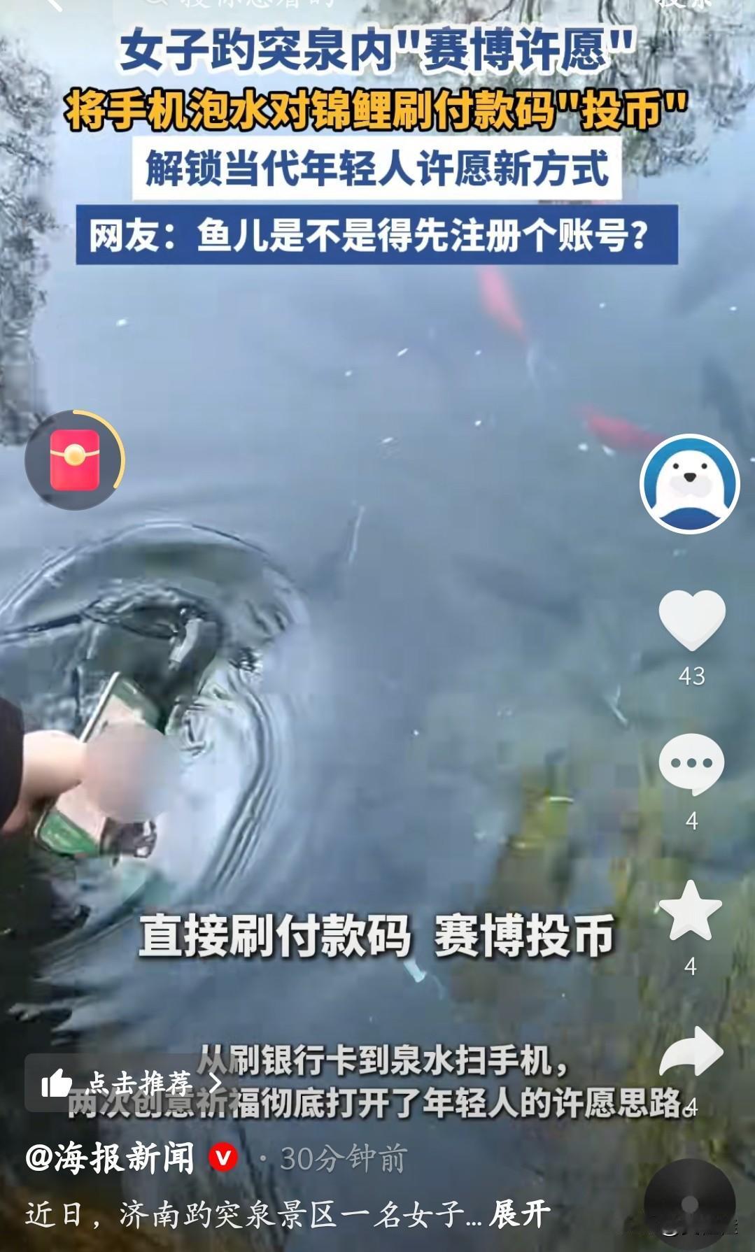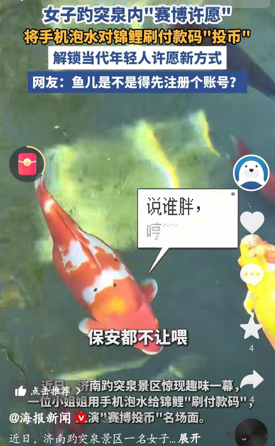 我看这是脑子进水!!刷到济南趵突泉这事儿,属实给我整懵了,这姑娘怕不是把脑子跟手机一块儿泡进泉水里了吧? 别人到许愿池都是投硬币求个好彩头,她倒好,直接把手机怼进水里对着锦鲤刷付款码,还美其名曰“赛博投币”。先不说手机泡水会不会报废,就说这锦鲤,就算真能通人性,也得先去办个收款码、注册个支付账号才能接住这份“心意”吧? 景区保安连喂鱼都不让,估计也没想到能遇上这么个奇葩操作。年轻人的脑洞确实大,但这种许愿方式也太离谱了,纯纯是为了博眼球瞎折腾。与其把手机泡水里搞这些花活,不如老老实实投个硬币,起码还能保住手机,也让锦鲤省省心。