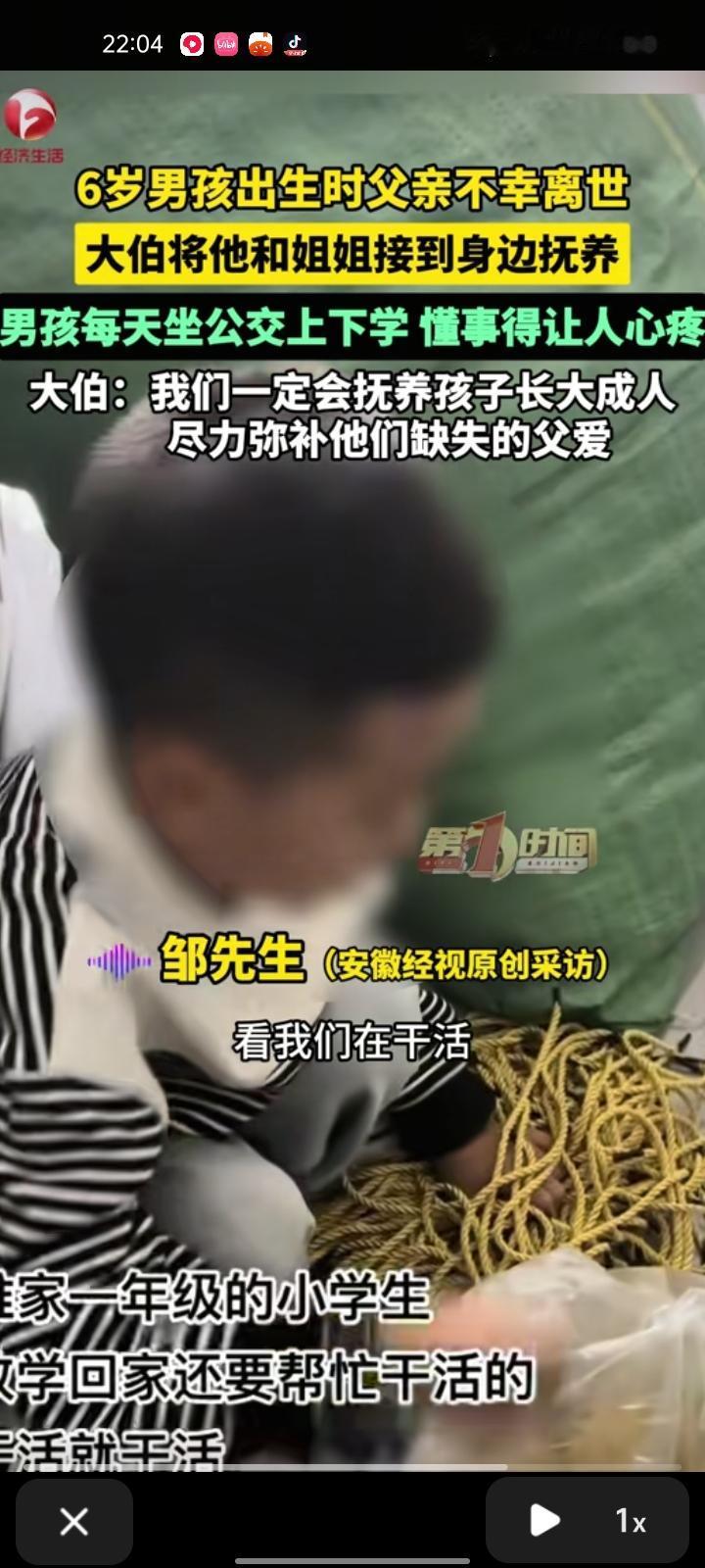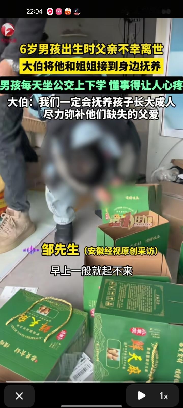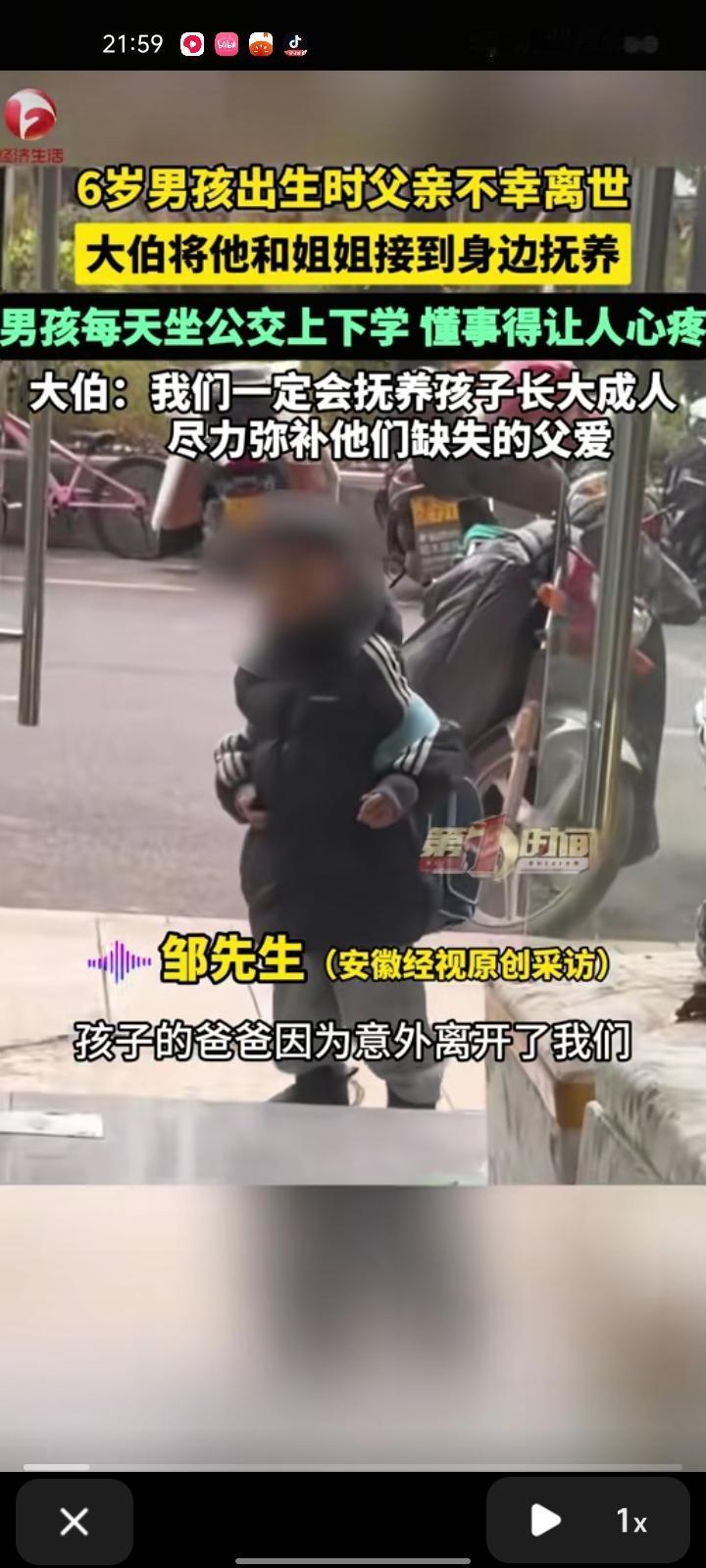 12月25日,云南昭通。六岁男孩出生时父亲因意外不幸离世,大伯把他和姐姐接到身边抚养。男孩每天坐公交上学,回来还要帮他们干活,懂事到让人心疼。 大伯邹先生表示,我们白天要干活,晚上基本干到半夜两三点,早上一般起不来送孩子读书。我们一定会抚养孩子长大成人,尽力弥补他们缺失的父爱。