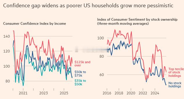 FT的这篇最新文章解释了美国斩杀线背后美国“K型经济”的现实:一边是拥有资产的阶层财富不断增长,另一边是低收入家庭生活水平停滞甚至下滑。这种分化已将“负担能力”变成美国政治议程中的焦点,对共和党明年的中期选举前景构成威胁,也对特朗普的总统任期造成压力。“随着房价和股市上涨,人们的净资产和财富持续增长”。“但对多数人来说,比如刚起步工作的人、不拥有住房或股票的人,他们只是勉强维持”。特朗普曾称“负担能力”是“最大的骗局”。但他也强调政府正努力压低物价。在12月17日白宫的一次演讲中,他将高物价归咎于拜登,并声称通胀已被“打压下去”。