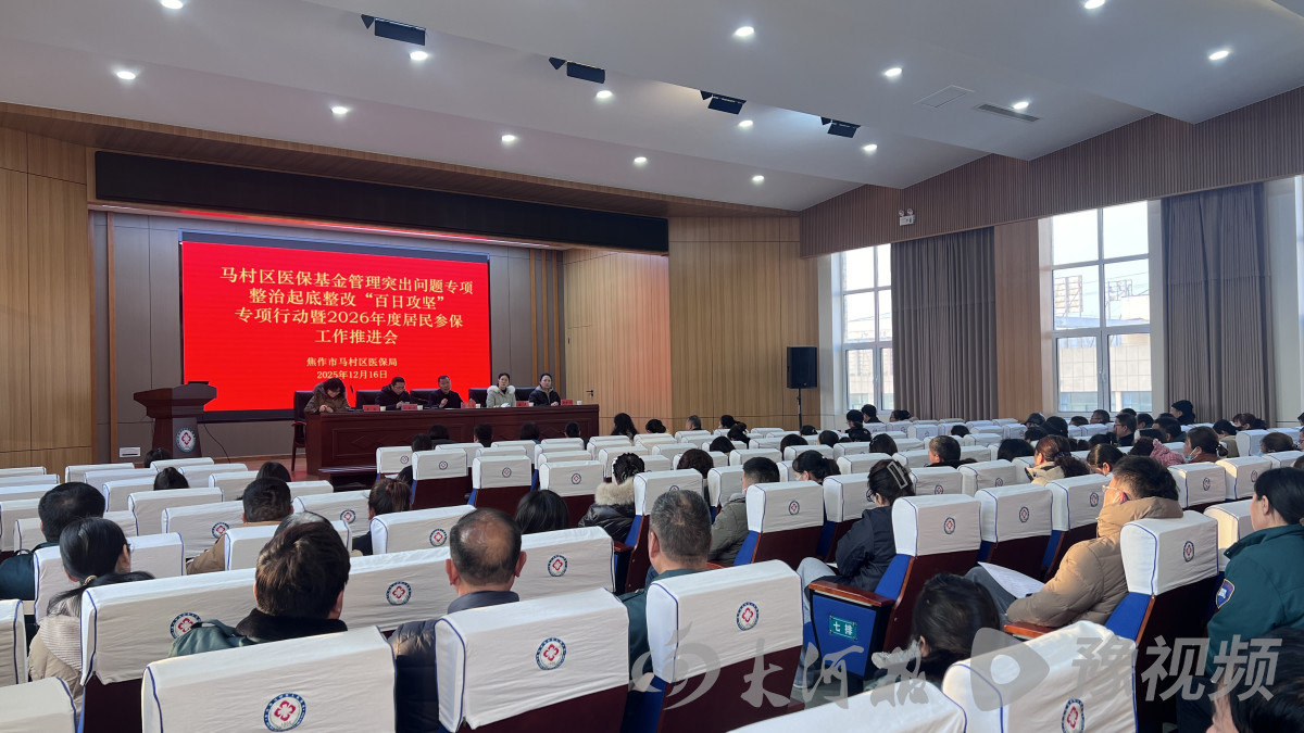 12月16日上午,焦作市马村区召开医保基金管理突出问题“百日攻坚”专项行动暨2026年居民参保工作推进会。区医保局全体班子成员、区纪委、区卫生健康委相关科室负责人、辖区医疗机构、定点零售药店、村室、诊所负责人等100余人参加了会议。