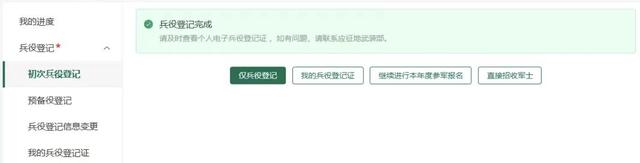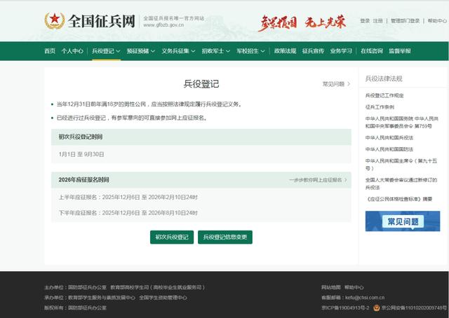 4.进行兵役登记时可同时参加2026年义务兵应征报名。上半年应征报名时间为2025年12月6日至2026年2月10日24时,下半年应征报名时间为2025年12月6日至2026年8月10日24时。如当年无参军意愿入伍意向,兵役登记时可选择“只进行兵役登记,申请2026年度缓征”。