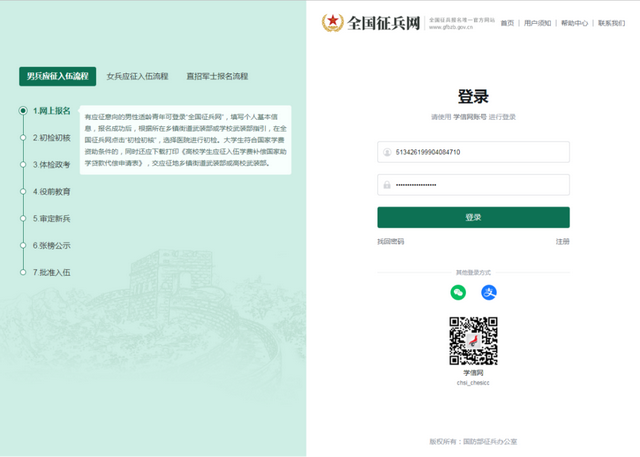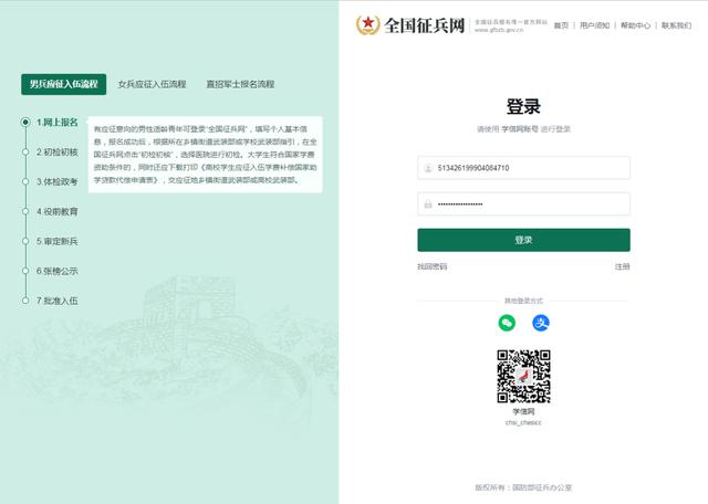一、适龄青年搜索“全国征兵网”(http://www.gfbzb.gov.cn/)注册后进行兵役登记。个人兵役登记确有困难的,也可持本人身份证、户口簿和学历证明,由户口所在地镇武装部协助登记。本人因特殊原因不能前往登记的,可委托家长代为登记。