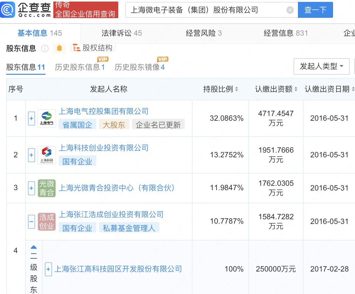 企查查APP显示,近日,上海微电子装备(集团)股份有限公司中标步进扫描式光刻机项目,中标金额约1.09亿元。据此前公告,招标方为科学技术部。企查查信息显示,该公司成立于2002年,经营范围包含:半导体装备、泛半导体装备、高端智能装备的开发、设计、制造、销售及技术服务等,由上海电气控股集团有限公司、张江高科(600895)全资子公司上海张江浩成创业投资有限公司等共同持股。