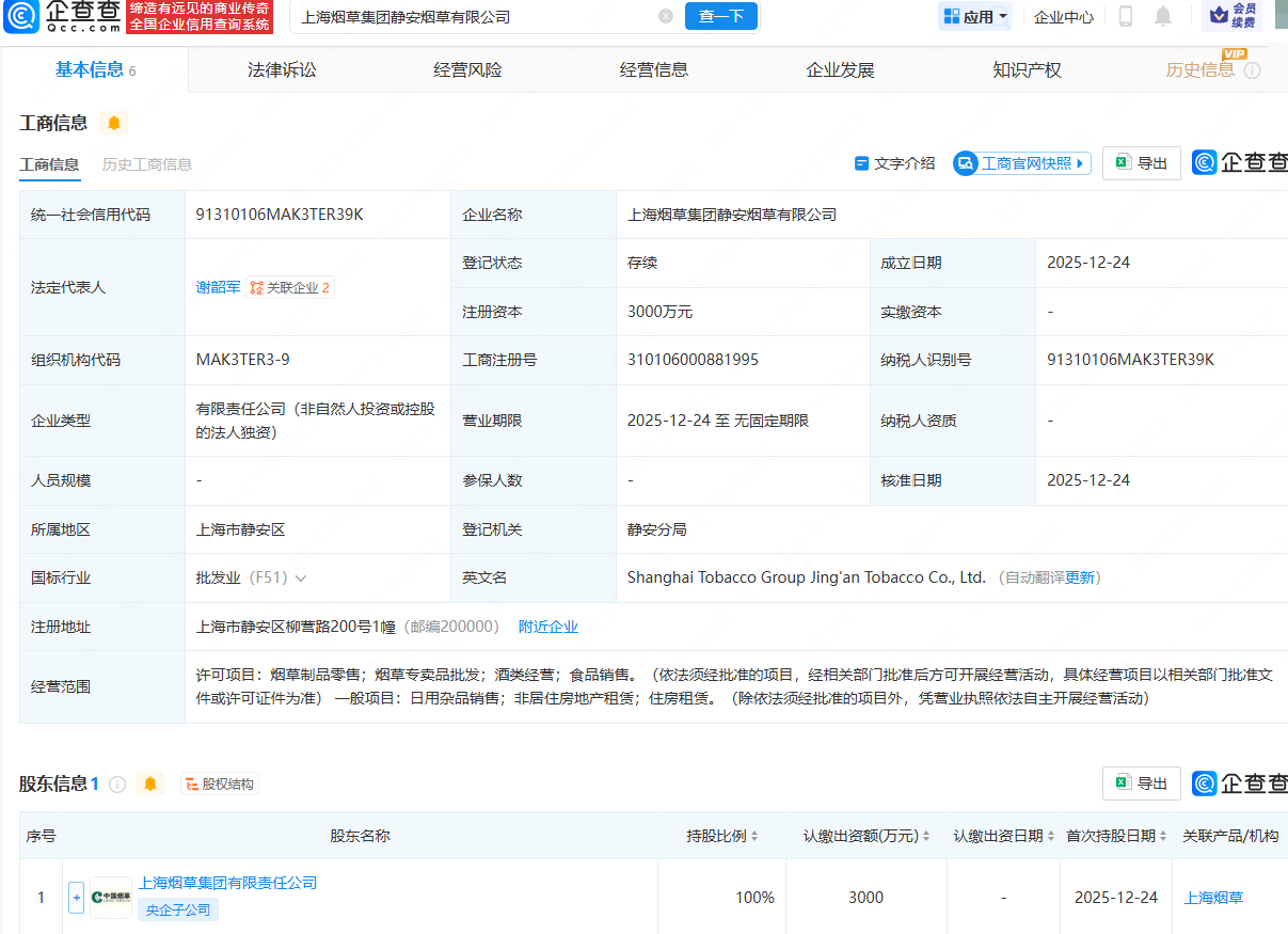 企查查APP显示,近日,上海烟草集团金山烟草有限公司、上海烟草集团静安烟草有限公司成立,注册资本均为3000万元,经营范围均包含:烟草制品零售;烟草专卖品批发;酒类经营;食品销售等。企查查股权穿透显示,两公司均由上海烟草集团有限责任公司全资持股。