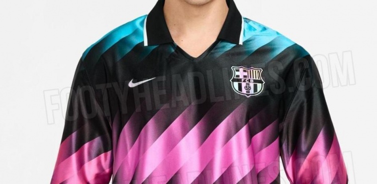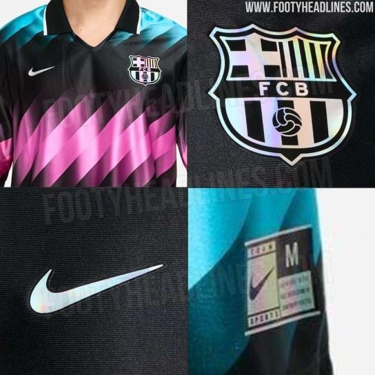 几周前,关于巴塞罗那新赛季球衣的消息已经开始流传,但这次“FootyHeadlines”分享了更多细节。这款由耐克设计的复古球衣采用了黑色底色,搭配对角线渐变的青绿色和粉色条纹,这种大胆的设计在巴塞罗那的历史上尚属首次。