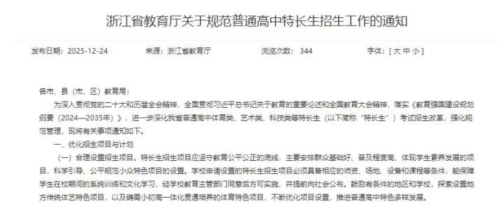 浙江省教育厅昨天发文规范普通高中特长生招生工作,内容包括优化招生项目与计划、严格报考条件与资格审核、完善招生录取机制、改进考试评价方式、加大监督及违规查处力度等。