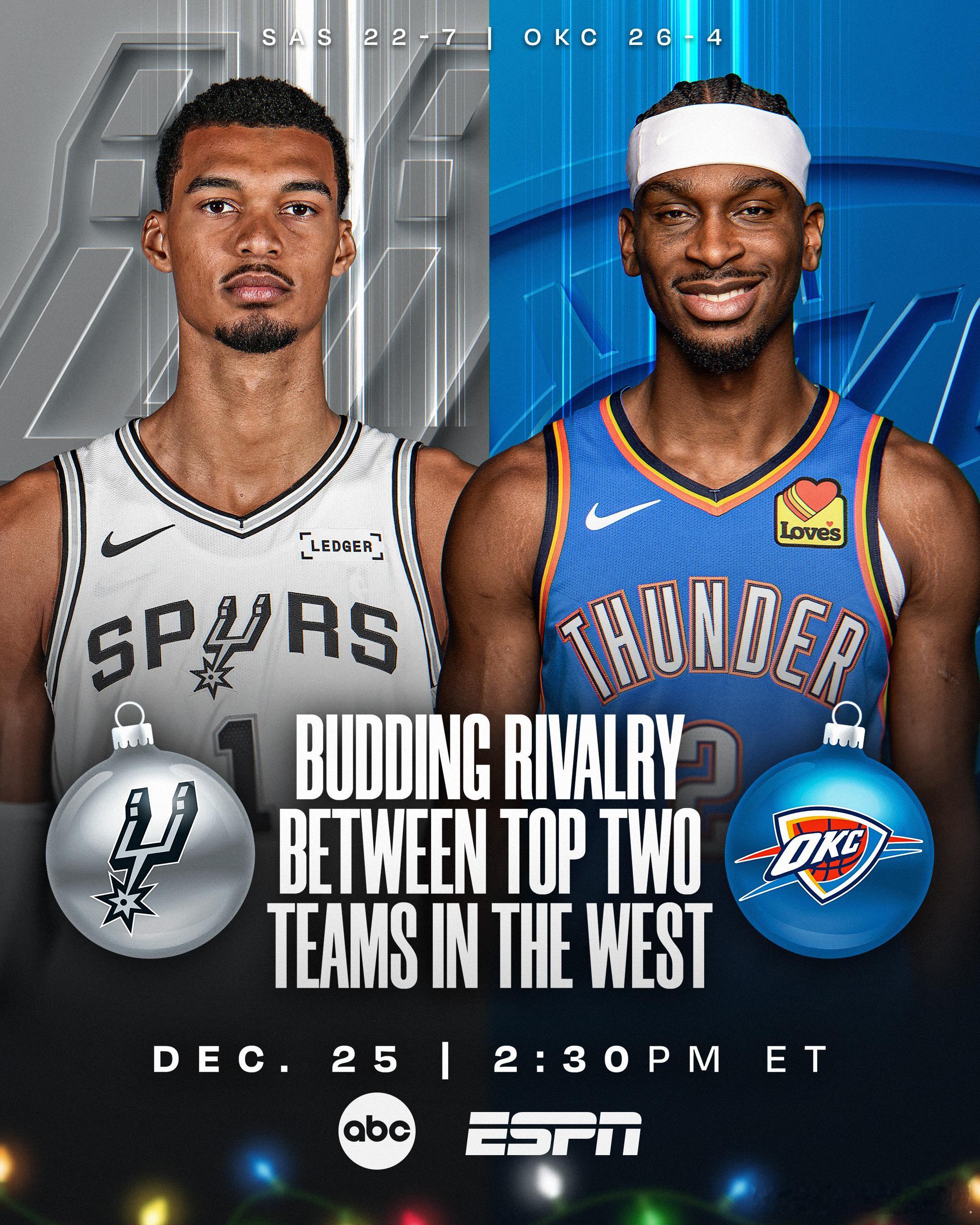 明日5场圣诞大战预告🎅🏻1:00 骑士vs尼克斯3:30 马刺vs雷霆6:0
