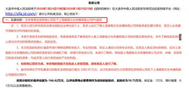 根据法院的拍卖公告,北京普思投资有限公司名下麦戟文化传播有限公司8%股权正式拍卖,评估值为-166.62万元,起拍价10.75万元。