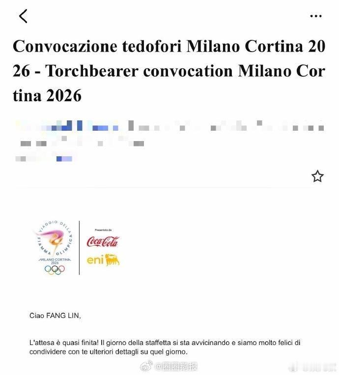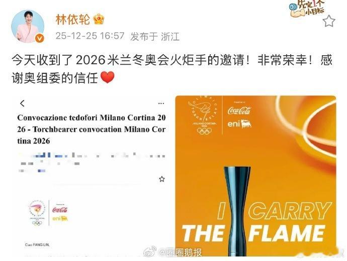 林依轮收到米兰冬奥会火炬手邀请 谁不爱这样的荣光时刻!林依轮晒2026米兰冬奥火