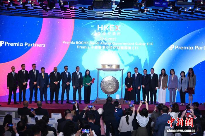2025年5月29日,香港交易及结算所有限公司与沙特阿拉伯证券交易所集团在香港合办“香港——沙特资本市场论坛”。现场亦举行Premia中银香港沙特伊斯兰国债交易所买卖基金(ETF)在香港上市的敲锣仪式。图为香港特区政府财政司司长陈茂波(右七)等嘉宾出席敲锣仪式。中新社记者李志华摄