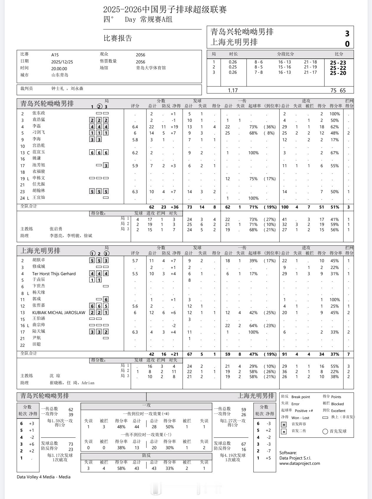 【技术统计】山东男排3比0上海男排(25-23 25-22 25-20)排超联赛2025-2026中国排球超级联赛