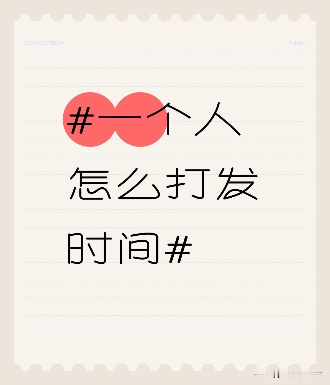 一个人打发时间,有很多有意思的选择。我就喜欢去书城,周末自然醒后,带两支笔一本书就出发。图书馆或大书店是绝佳去处,书的种类多到让人眼花缭乱。 在那里,能从生活艺术长廊走进哲学历史的世界,也能从青年文艺栏目钻进专业知识的海洋。我常一头扎进专业或职场书籍里,像《华为时间管理法》《麦肯锡教我工作法》,能学到不少干货;也会读点文学作品,如《随心所欲》《走向光明》,感受文字的魅力。一整天沉浸在书的世界,时间不知不觉就过去了,既充实又有意义。