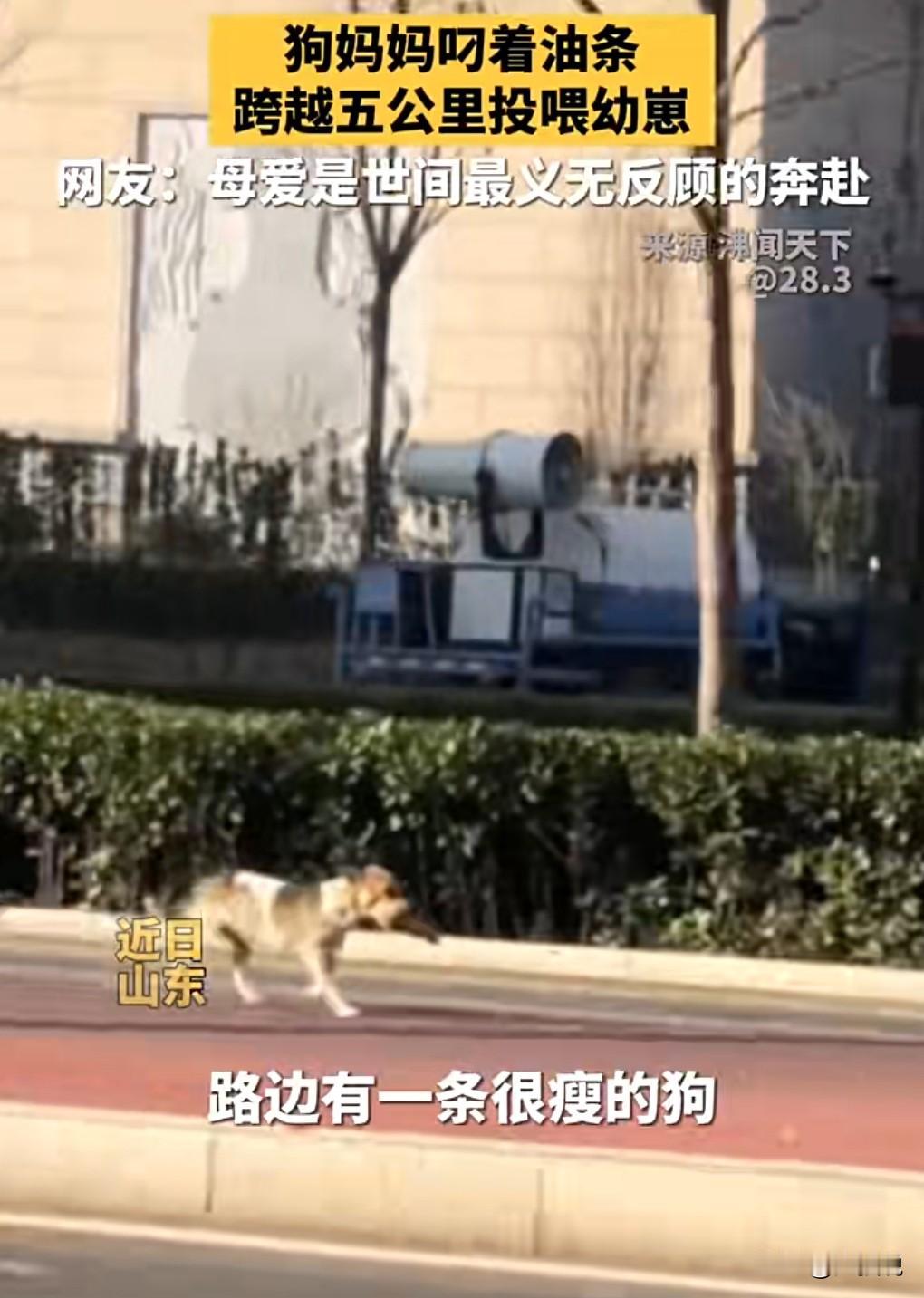 母爱在动物界都是相通的。 狗妈妈叼着油条,跨越五公里投喂幼崽。 这真的是太伟大了。 一车主发现这个狗叼这个油条也不吃。出于好奇心就一直跟着,来到了5公里外的一个停工工地,原来是投喂幼崽。 这大冷的天。 已经有好心人安置了这些狗,提供住宿。