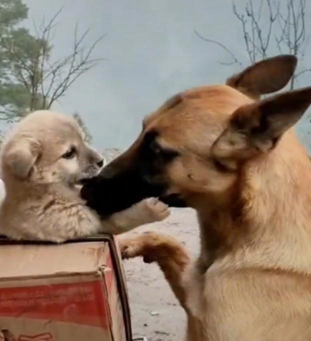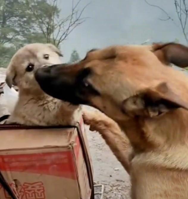 主人骑摩托到城里送东西,将小狗一起带去送人喂养,刚将小狗放上纸箱,狗妈看见后,瞬间从屋里奔出扑上纸箱,用舌不停的舔着它的狗宝,还连续哼叫着并用前爪狠抓纸箱扑腾摩托,结果将摩托扑倒后救出狗宝。狗妈的这一行为表现很是感人,意思很明确,不让主人将它的狗宝送走。母爱真伟大,为了它的崽不被失去,在这个时候它会去保护的。你如果要将它的狗宝送人喂养,最好是悠着点,除非不让它看见。