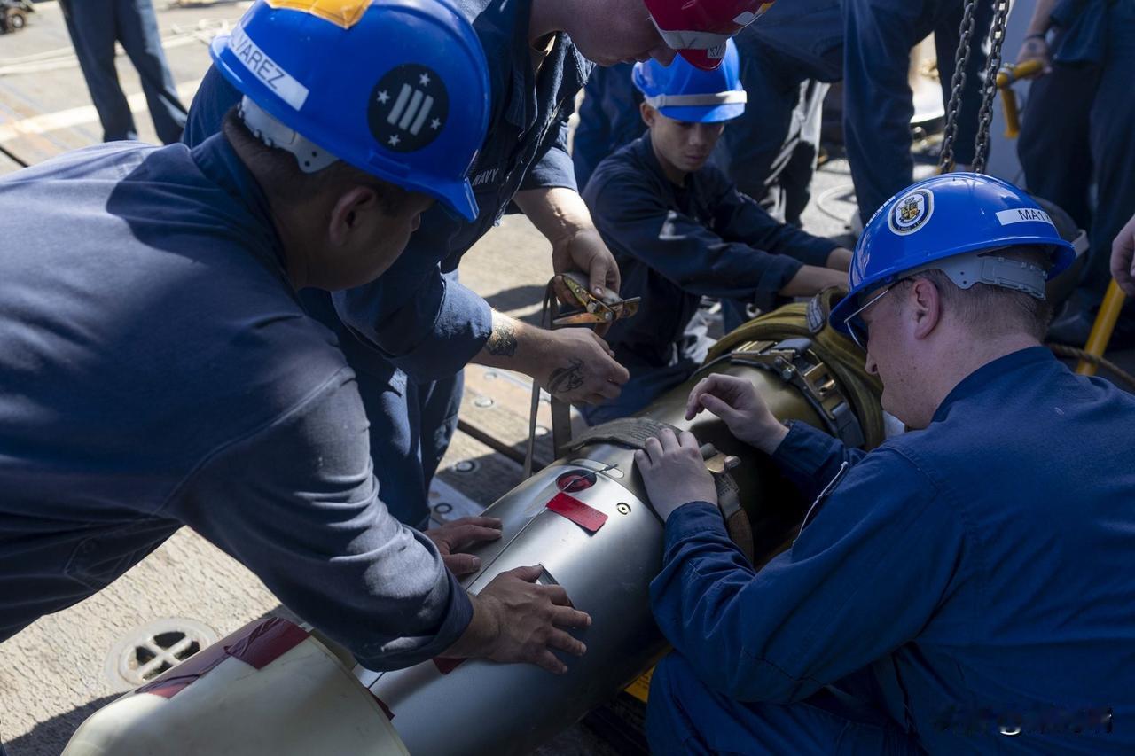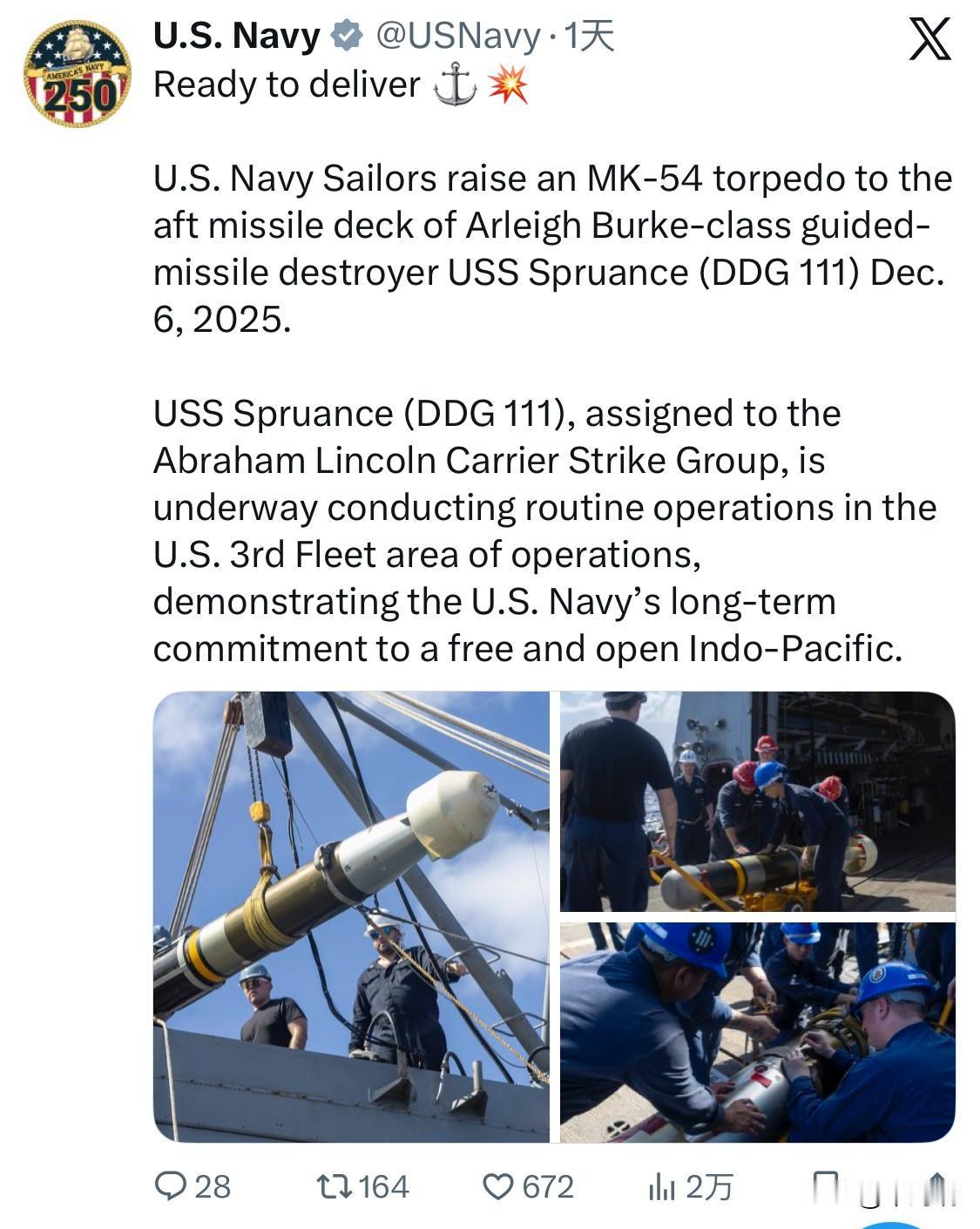 2025年12月6日,美国海军水兵将一枚MK-54鱼雷吊装到阿利·伯克级导弹驱逐舰“斯普鲁恩斯”号(DDG 111)的后导弹甲板上。 隶属于亚伯拉罕·林肯号航母打击群的斯普鲁恩斯号驱逐舰(DDG 111)正在美国第三舰队作战区域进行例行行动,这体现了美国海军对自由开放的印太地区的长期承诺。