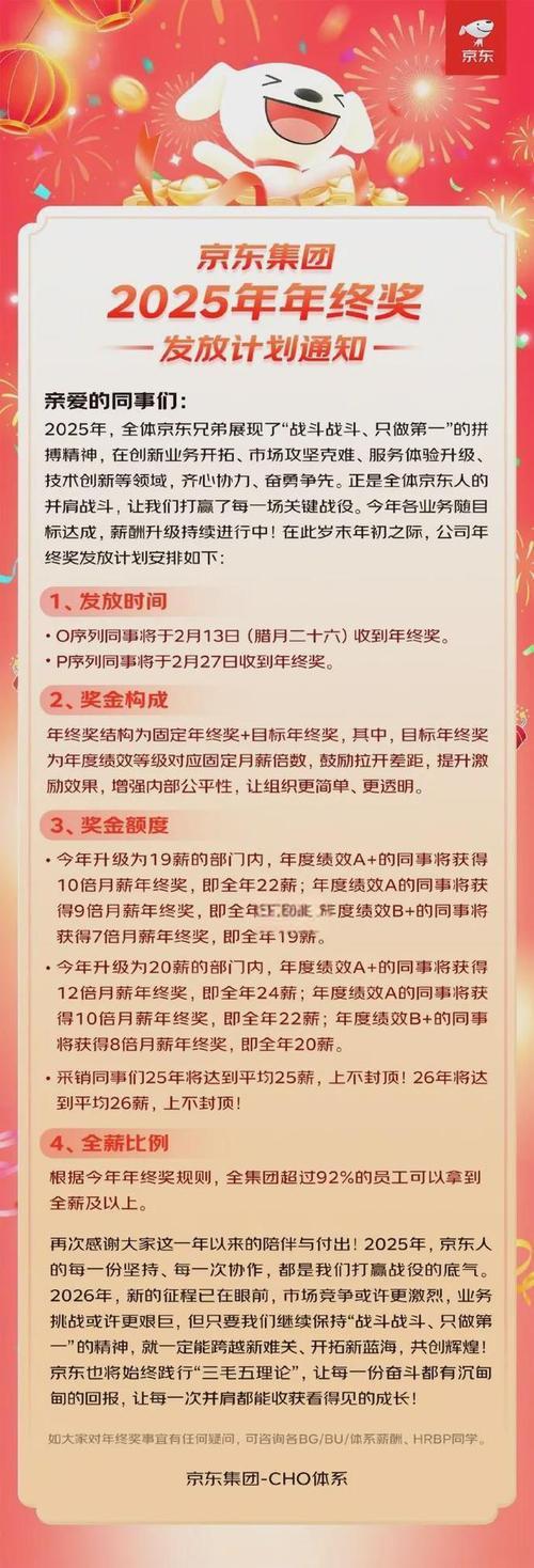 京东2025年终奖太狠了!92%员工拿满甚至超额,总投入暴涨70%,直接霸屏打工人朋友圈。 绩效规则明明白白:19薪部门A+绩效能拿22薪,20薪部门A+直接冲24薪,采销更夸张,平均25薪还上不封顶。对比不少公司砍福利、缩年终奖,京东这波操作堪称行业清流。 三年七次涨薪,刘强东是真把“善待员工”落到实处。毕竟企业赚钱了愿意和员工分红利,才是最实在的安全感。打工人羡慕归羡慕,也得承认:这样的年终奖,背后是实打实的业绩和付出呀!