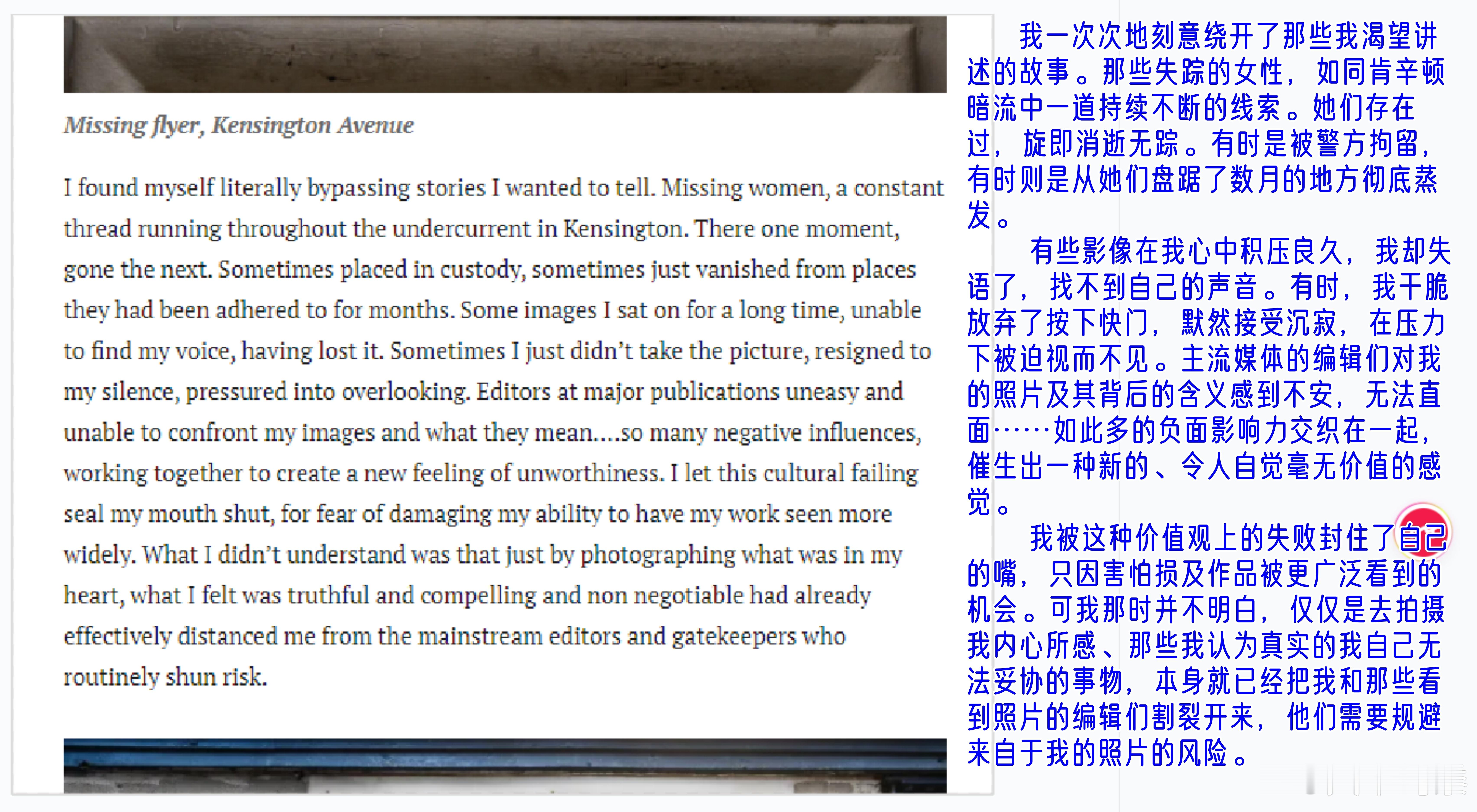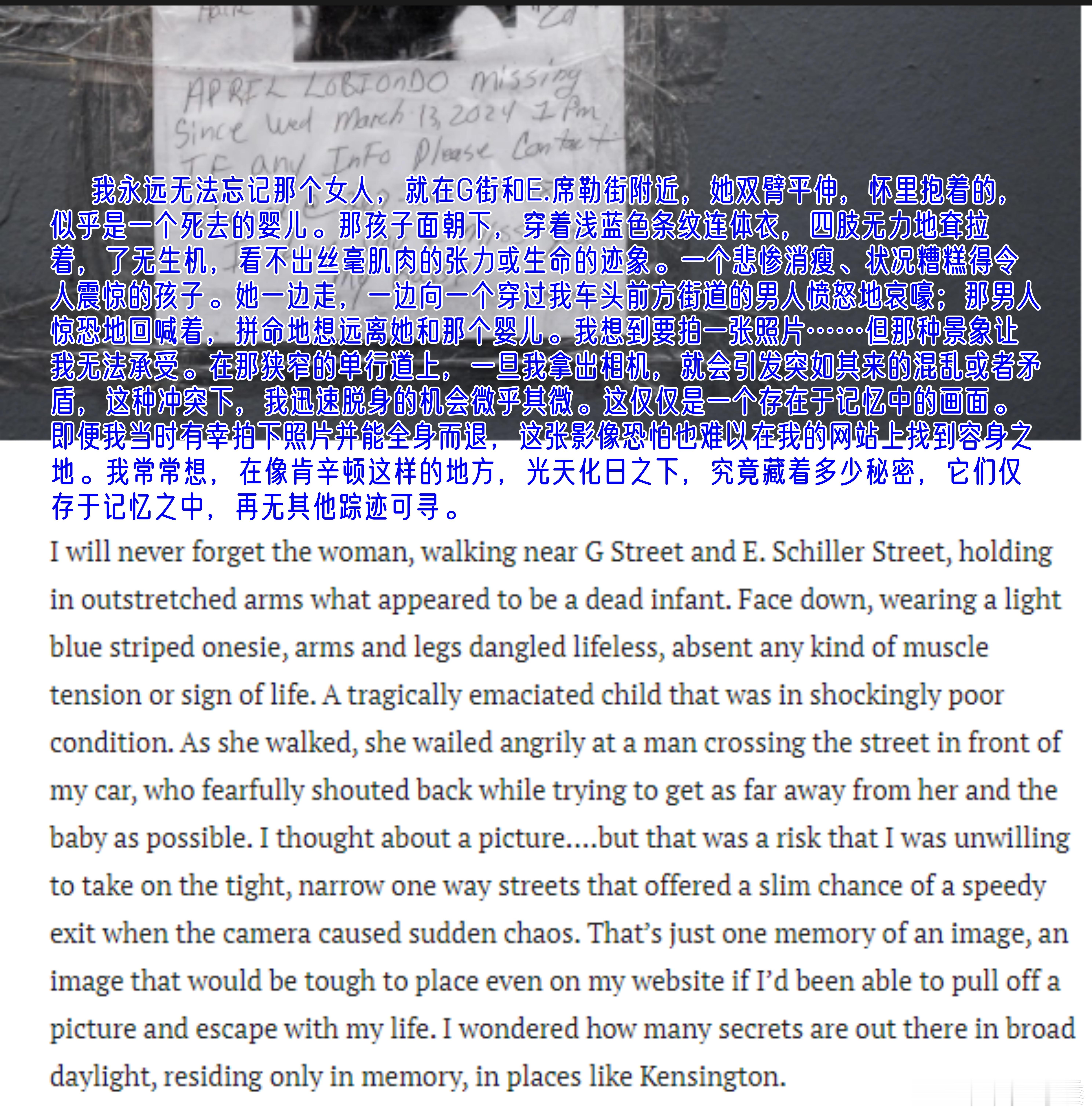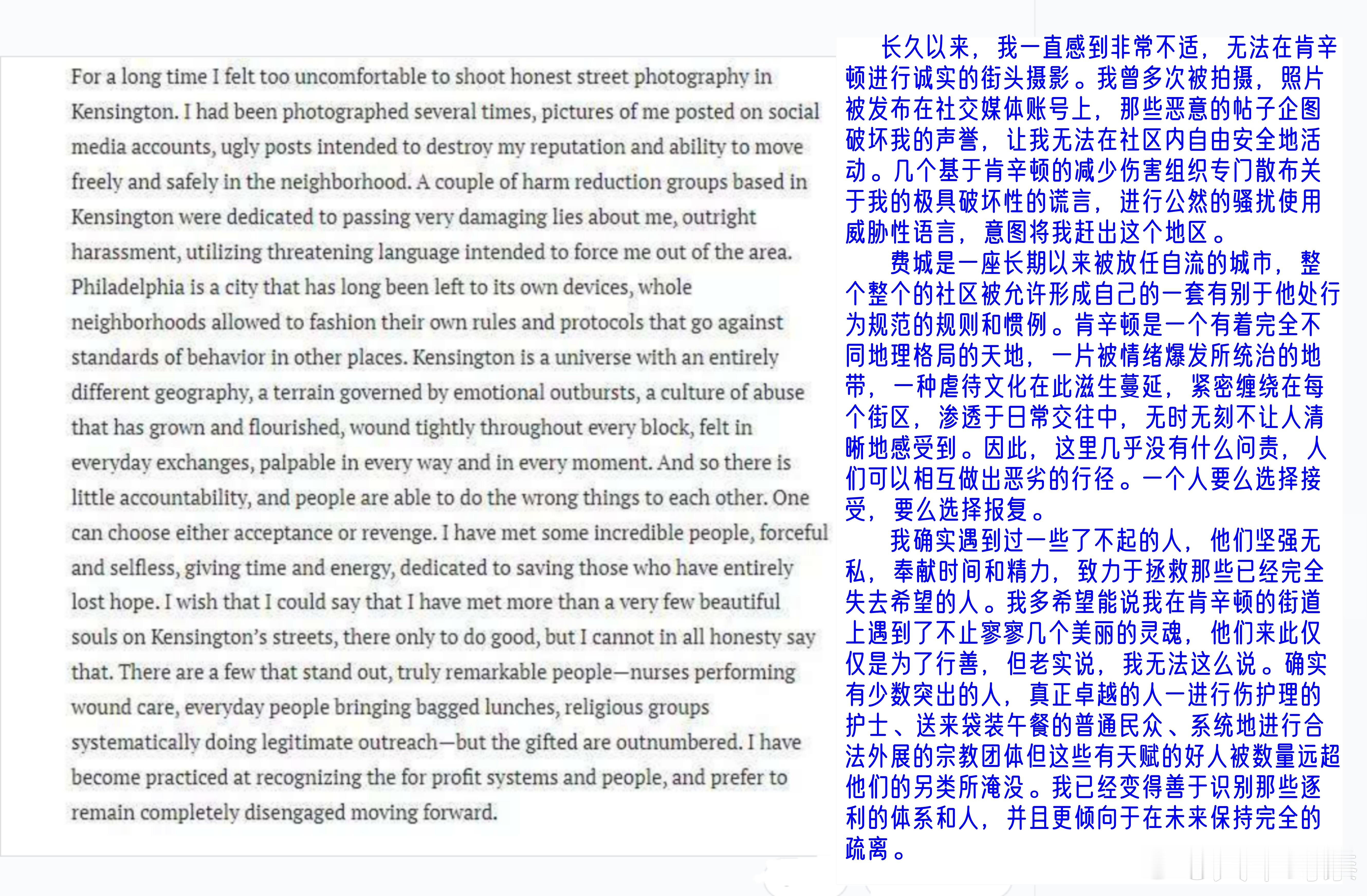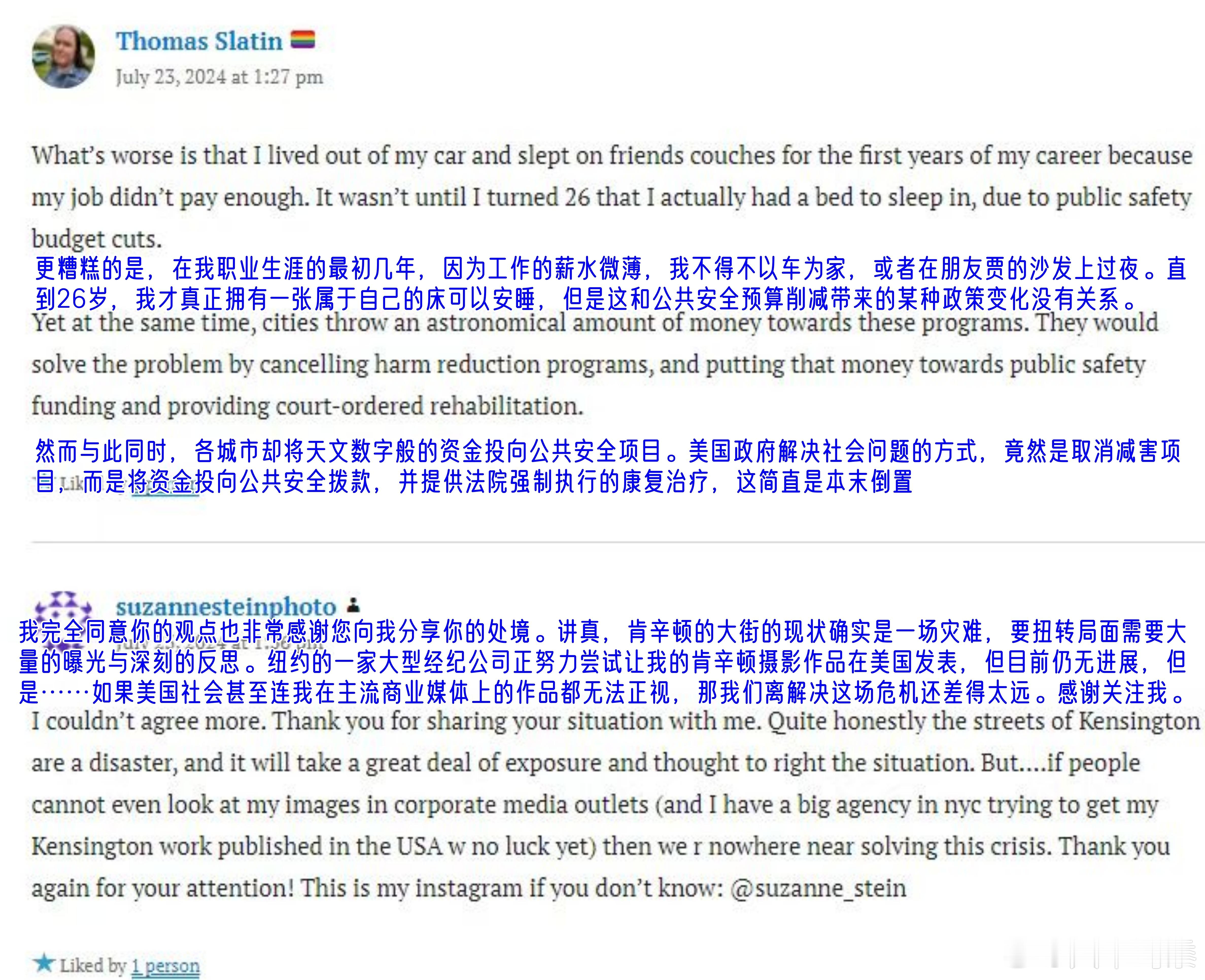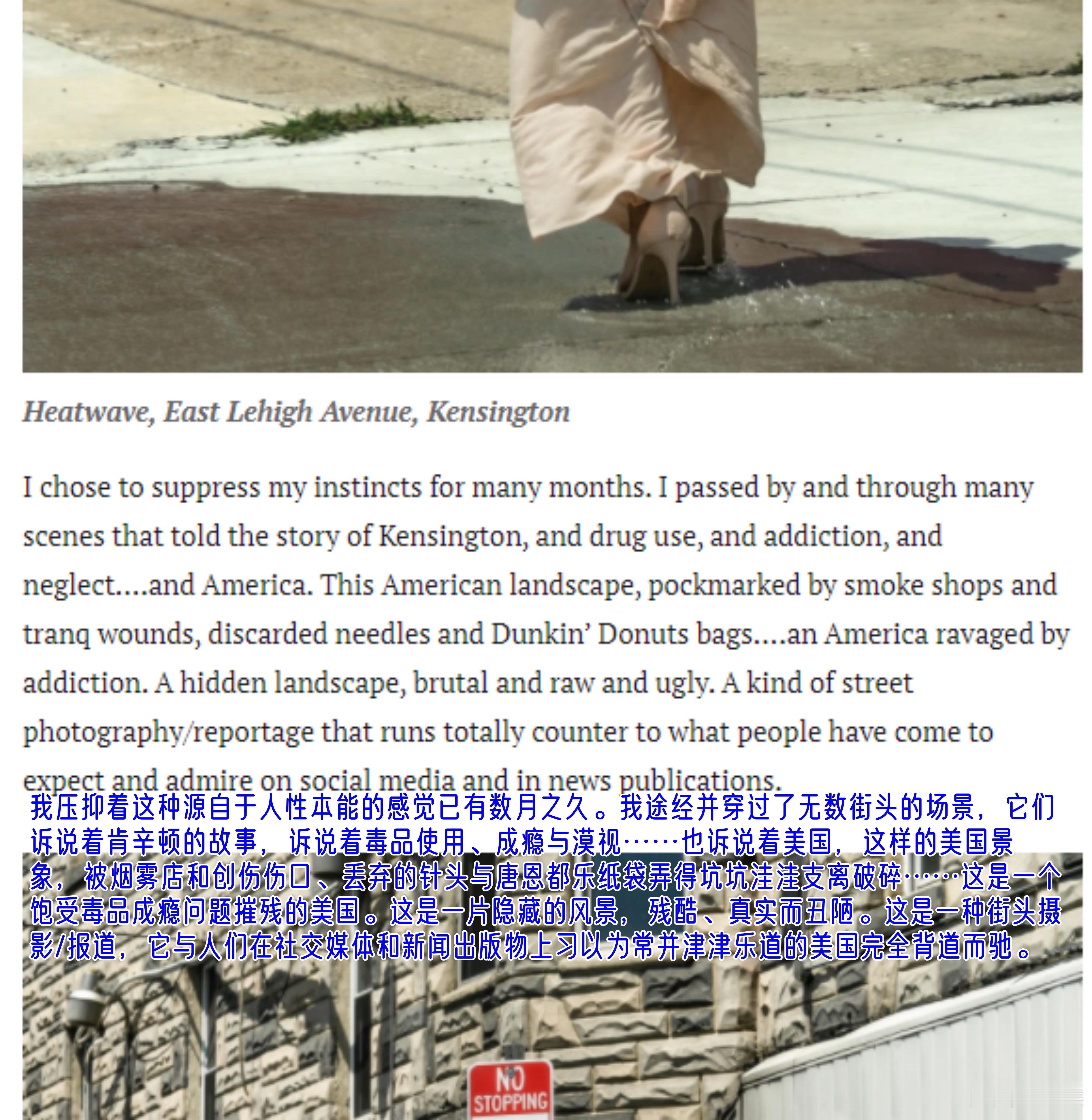 看到了一位叫苏珊娜·斯坦的美国摄影师的街头摄影作品,作者把镜头对准了美国费城肯辛顿大街的角角落,对准了那些被忽视的美国人,用镜头和文字记录了她的感受,也记录了最真实的美国。或许,她的摄影作品和文字,能够为我们揭开美国斩杀线现象 深层逻辑。在美国,没有专业媒体愿意发布她的摄影作品。