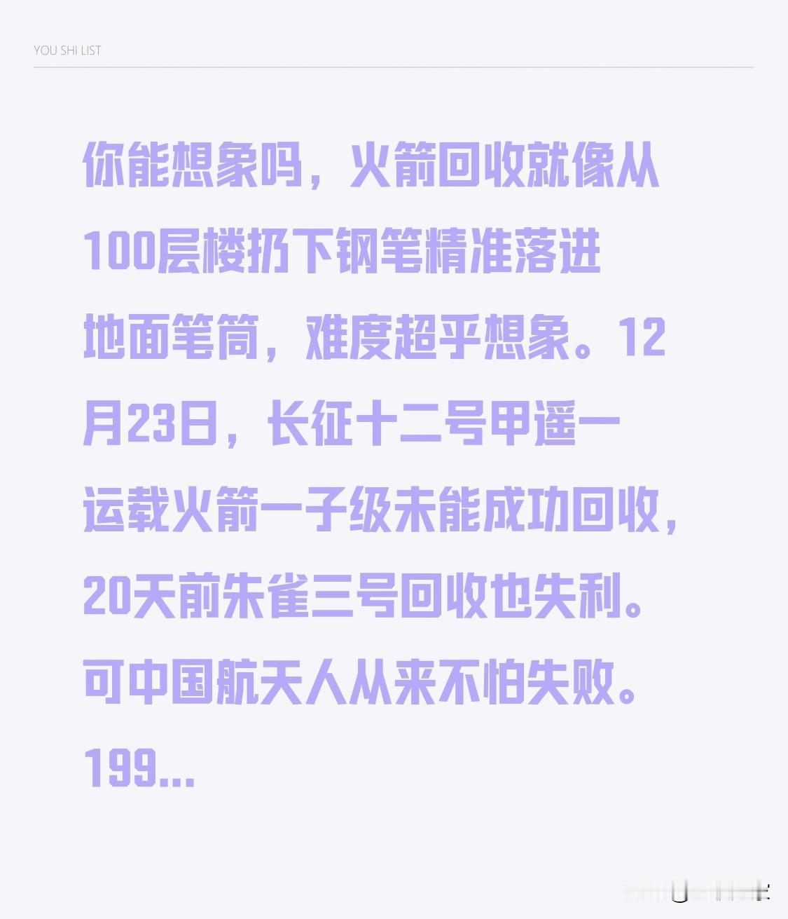 你能想象吗,火箭回收就像从100层楼扔下钢笔精准落进地面笔筒,难度超乎想象。12月23日,长征十二号甲遥一运载火箭一子级未能成功回收,20天前朱雀三号回收也失利。可中国航天人从来不怕失败。1996年长征三号乙火箭发射失败,航天人几百个日夜排查故障;2017年长五遥二任务异常,团队没日没夜归零复盘,最终长五成功复飞。 中国航天从来不缺从头再来的勇气。未来,中国火箭回收能否成功?还会遇到哪些挑战?我们又将见证怎样的突破? 朱雀三号火箭 长征五号乙火箭 朱雀2号火箭 朱雀三号火箭 长征五号乙火箭 朱雀2号火箭 长征12号火箭 太空火箭回收 可重复回收火箭 马斯克回收火箭