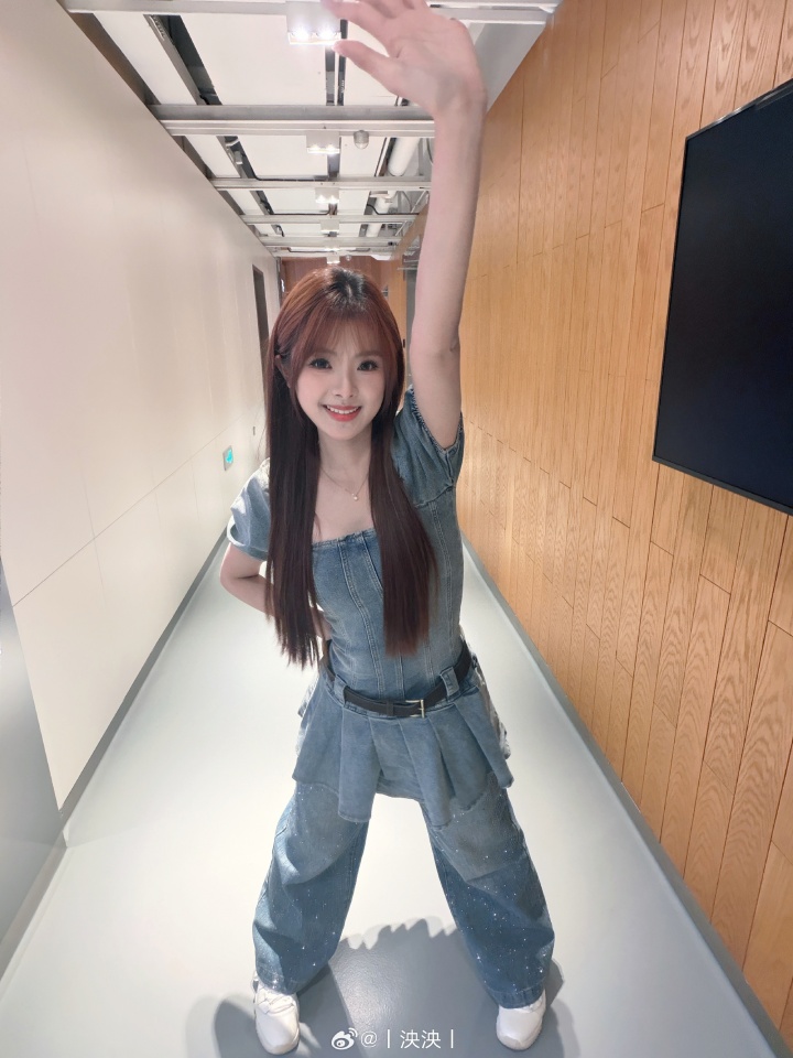 LPL互动女主持人泱泱分享近照:牛仔套装~祝大家圣诞快乐~