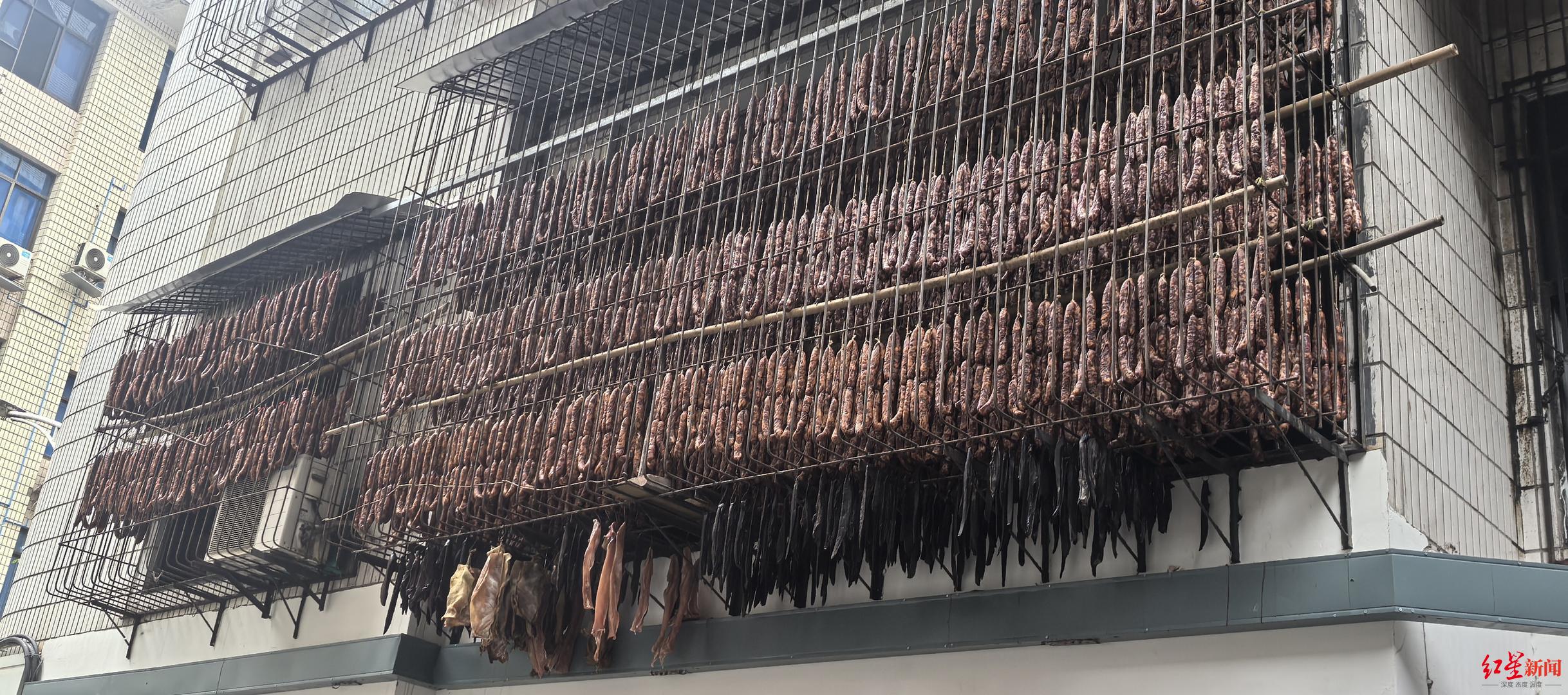 2025年12月23日,临近新的一年,红星新闻记者再次来到这家“大户人家”,看到防护栏上再次挂满了香肠。
