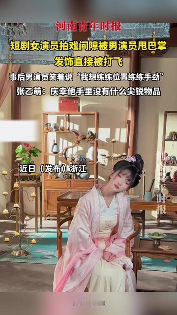 短剧女演员张乙萌竟在拍摄间隙被男演员掌掴,发饰甩飞,这究竟是怎么回事? 2025年12月,《犟骨》剧组发生了一起令人震惊的事件。女演员张乙萌在完成当天拍摄任务后,休息间隙突然遭到男演员的掌掴,发饰瞬间甩飞,场面一度失控。更让人气愤的是,该男演员事后竟嬉皮笑脸地辩称,只是想“练练位置练练手劲”。此事件迅速引发了公众的广泛关注和讨论,不仅让张乙萌感到震惊和愤怒,也暴露出影视行业内部可能存在的安全隐患。张乙萌表示,此类事件的发生让她更加重视个人安全,同时也提醒同行们,在工作中要时刻保持警惕,防范不可预料的暴力行为。此事件也再次引发了关于短剧拍摄过程中是否应加强安全管理的讨论,业内人士指出,拍摄过程中需严格遵循安全规范,避免不必要的伤害。 这起事件无疑给影视行业敲响了警钟,加强安全管理、提升职业道德建设刻不容缓。你怎么看待这起事件呢?快来评论区发表你的看法,一起为影视行业的健康发展贡献力量!张乙萌张乙萌被扇巴掌