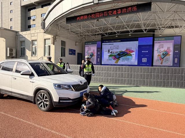 阳光讯(记者熊玺文/图)为筑牢校园交通安全防线,践行“预防为主”工作理念,切实守护中小学生出行安全,12月25日,西安市公安局交管支队碑林大队东大街中队网格民警走进西师附小,以“金盾护苗”为主题开展沉浸式交通事故防范演练活动,切实守护中小学生出行安全。