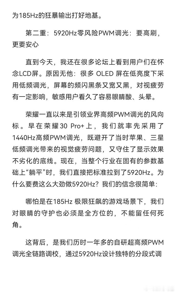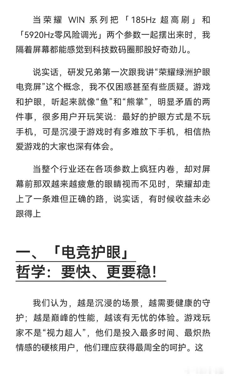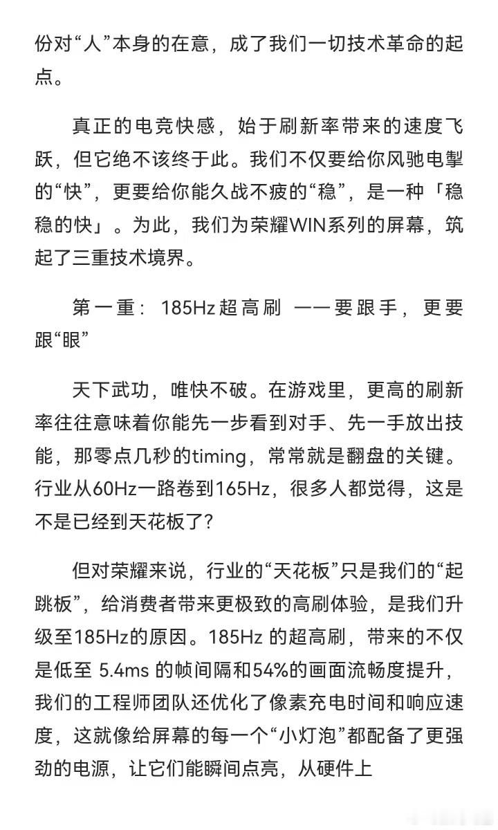 荣耀WIN 发布会前夕,又刷到关总的分享,感觉是想以长文的形式做一个系列,昨天的电池之最,今天又是185Hz刷新率和高频pwm调光之最,荣耀这些年在行业中确实有很多领先,已经在蹲后续了!
